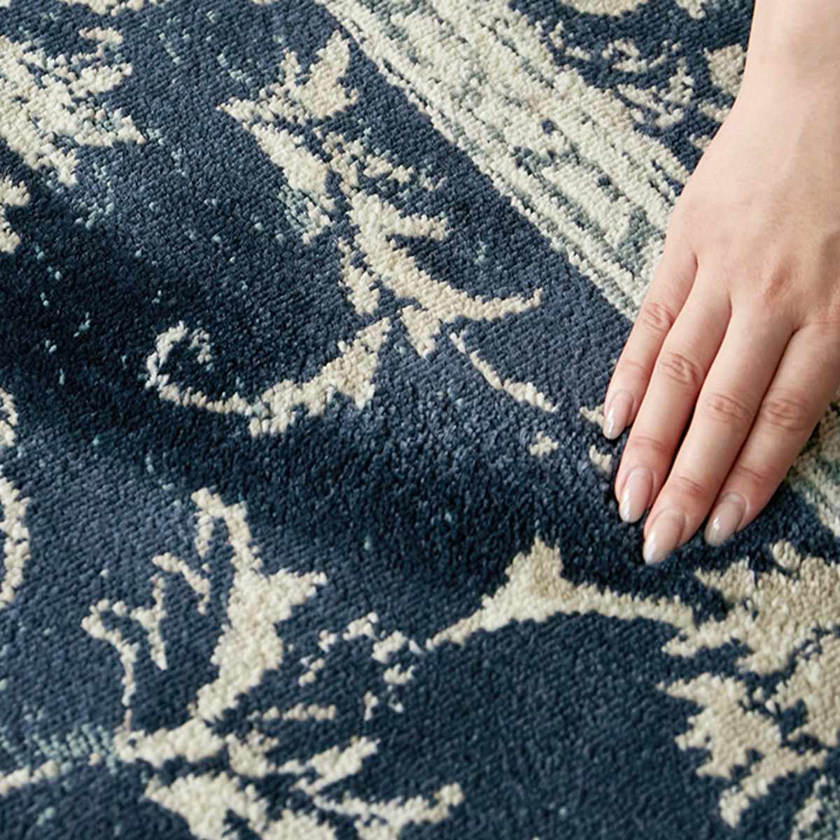 優れた耐久性と手織りのような風合いを兼ね備えたウィルトン織ラグ。裏の美しい織り目にも丁寧な仕事が表れています。