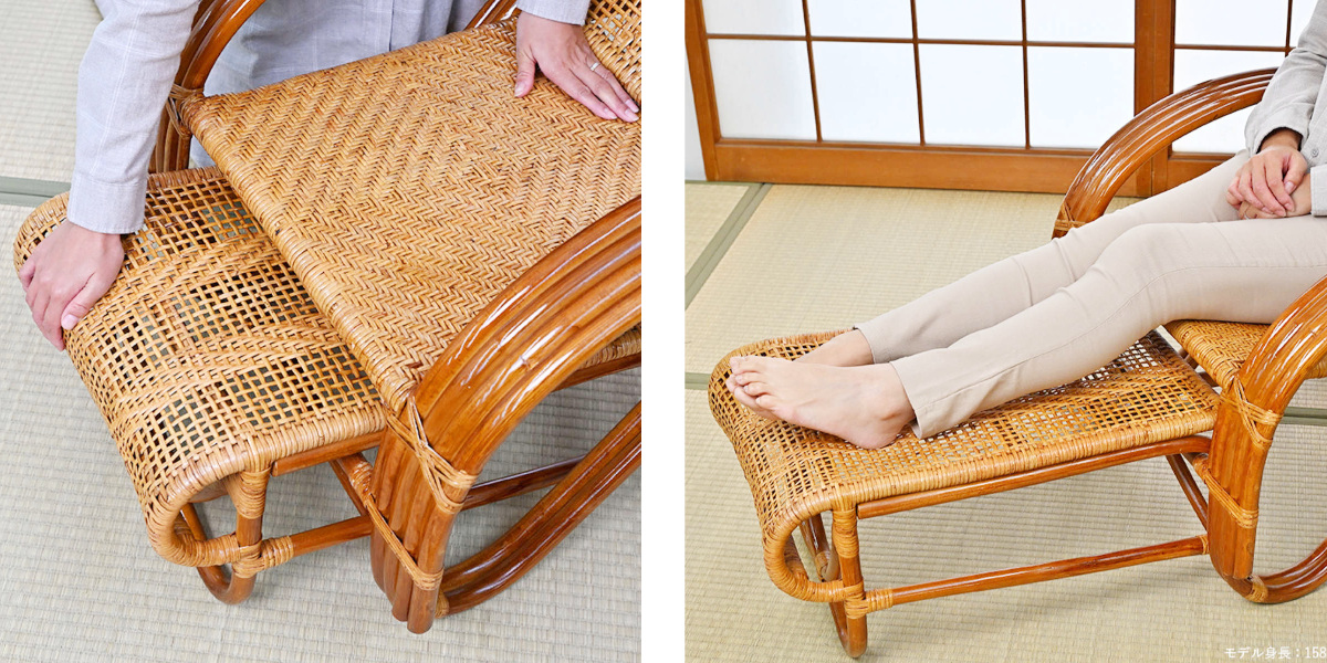 握りやすい太さのラタン肘掛け付き。立ち上がる際の支えとしても使えるため、日常の動作をサポートしてくれます。