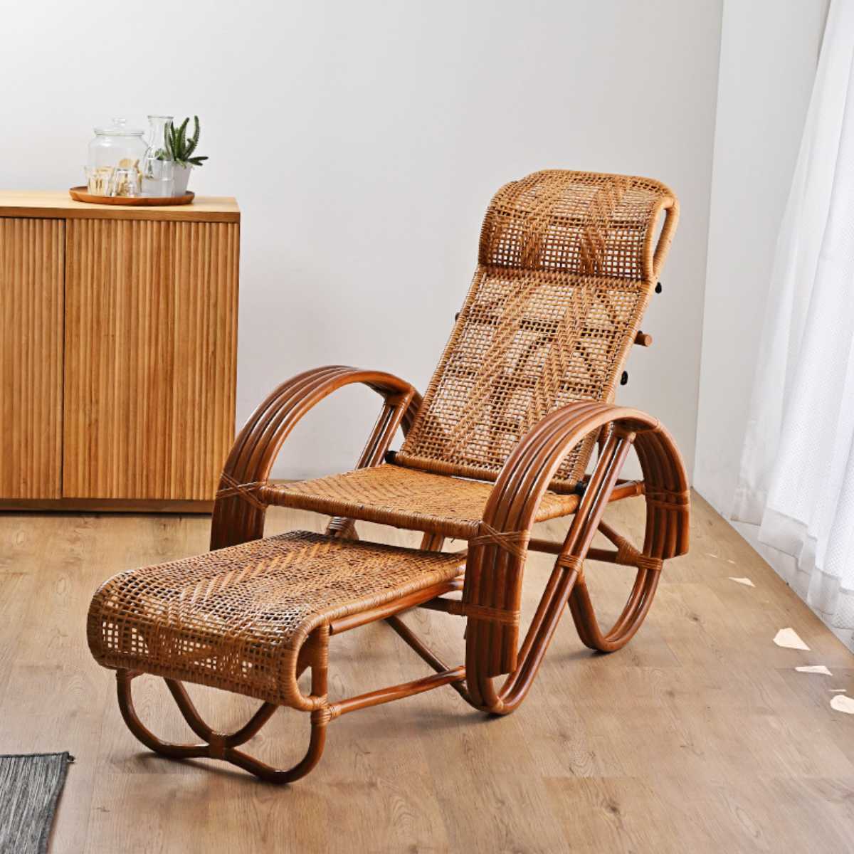 天然ラタンのやさしい風合いと、身体をゆったり預けられるリクライニング設計のチェアです。職人の手仕事で丁寧に編み上げられた座面と、ハイバック+フットレストで 、リラックスタイムをもっと心地よく快適に過ごせます。