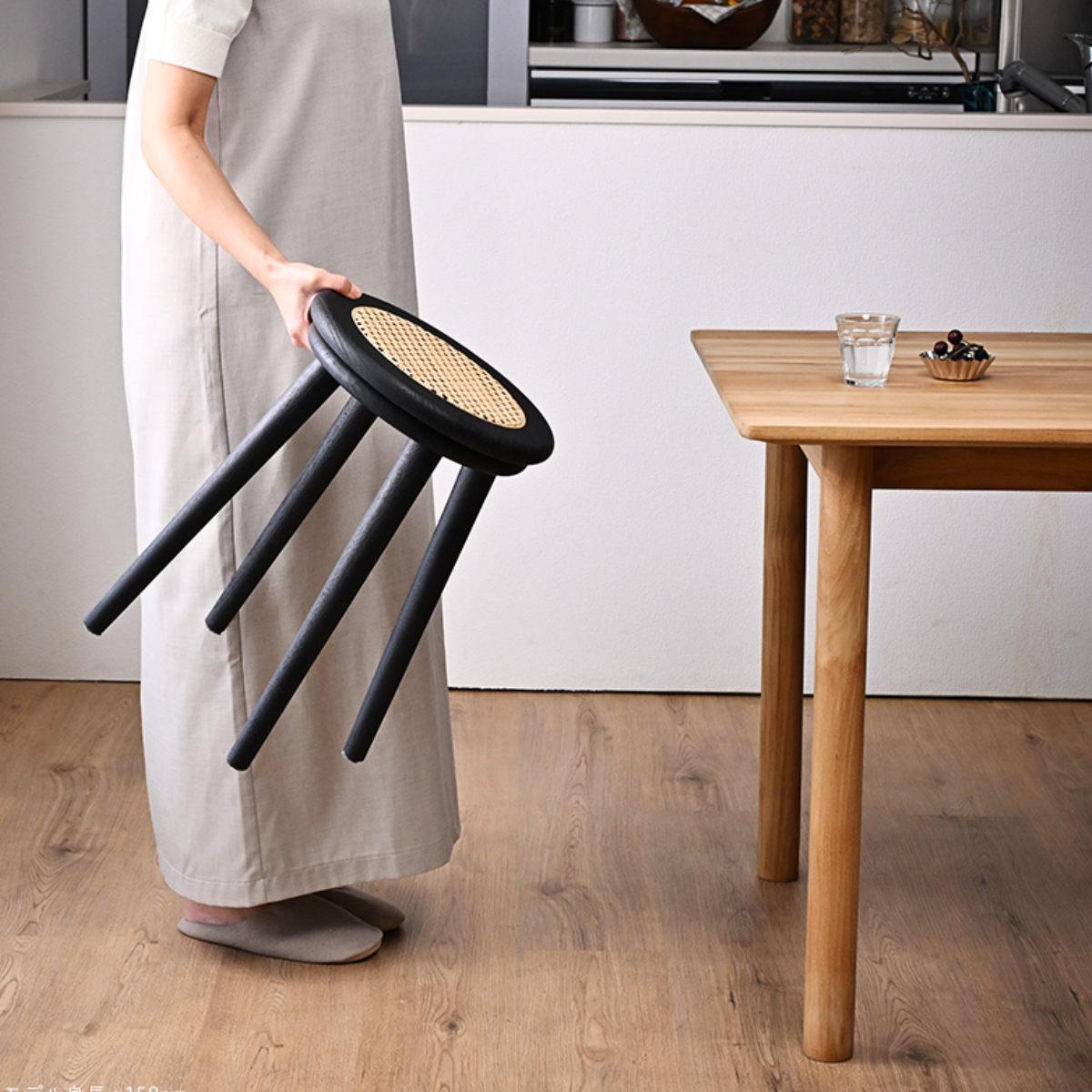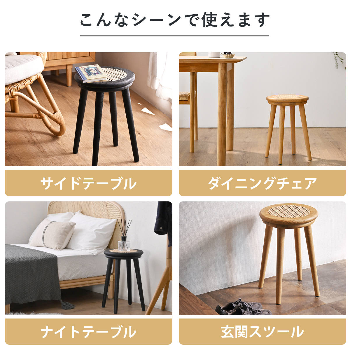 スツールとしてはもちろん、ソファサイドのミニテーブルやドレッサーチェアとしても活躍。置いておくだけで絵になるデザインは、空間のアクセントとしてもおすすめです。