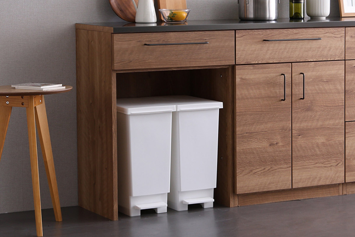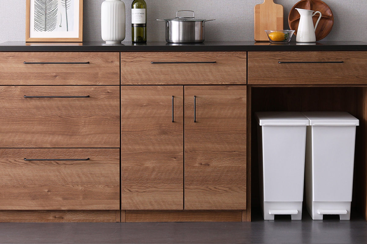 カウンター下にゴミ箱を収納できるため、キッチンをすっきりと見せることができます。デッドスペースになりがちなゴミ箱上を、収納や作業スペースとして有効活用できるので便利です。