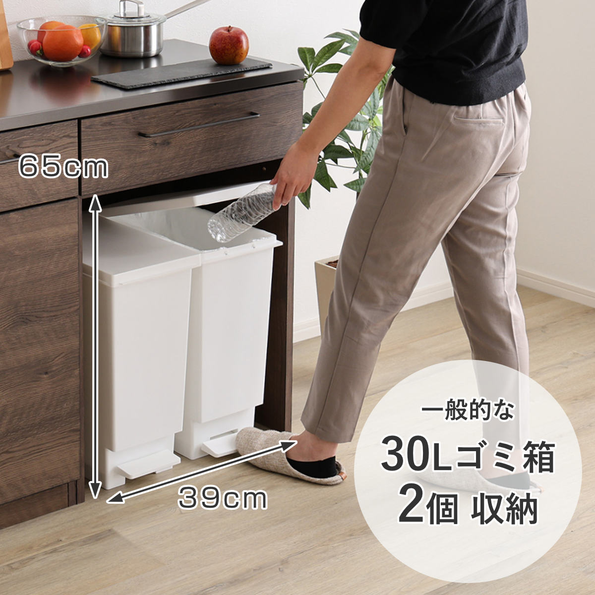 内寸幅約39cm、高さ約65cmで、一般的な30Lサイズのゴミ箱を2個収納可能です。