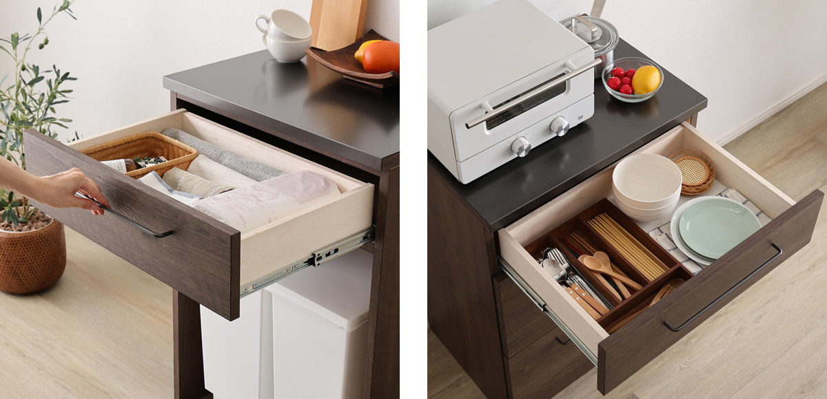 引出し収納棚は浅型が1杯、深型が2杯の計3杯の引き出し収納を備え、カトラリーや調理小物、食品ストックまでまとめて収納するのに便利です。