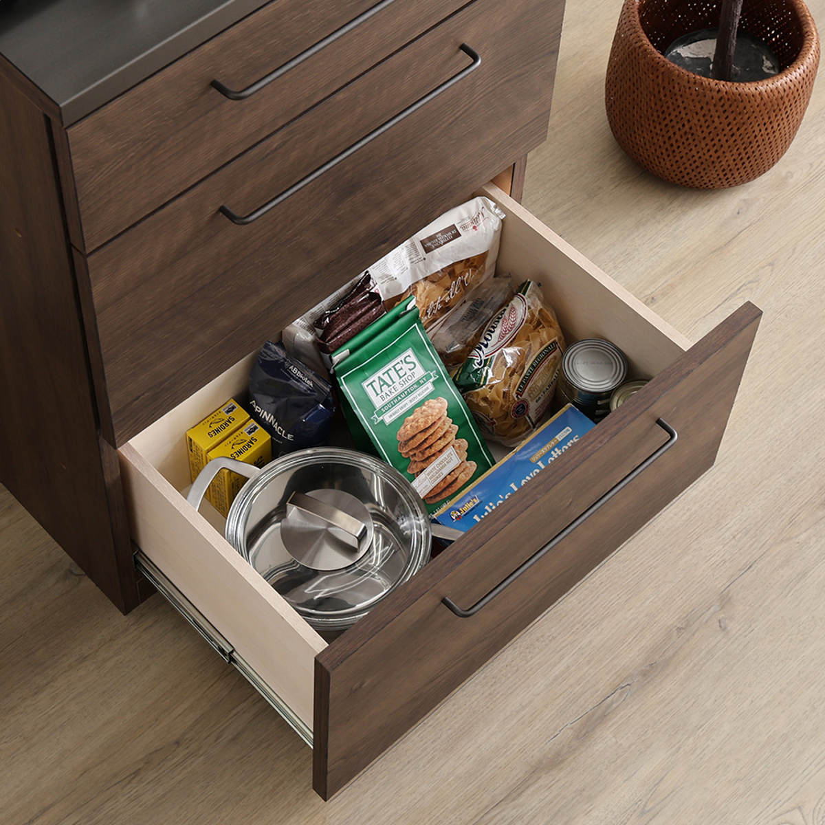 調理器具や保存容器、ストック食材など、かさばりやすいキッチン用品をまとめて収納できます。