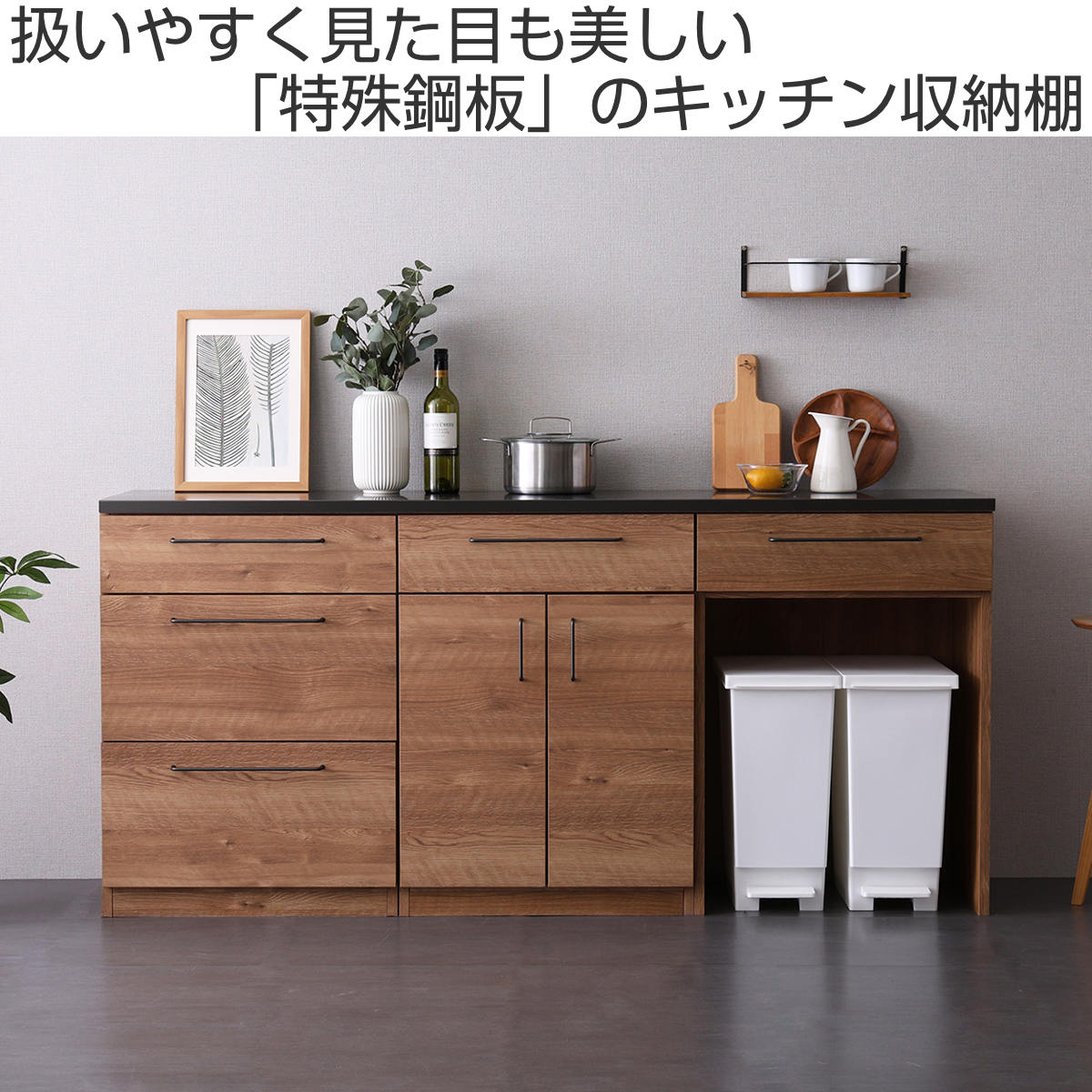 キッチンカウンター 幅180cm 3点セット チェスト 開き扉 ゴミ箱上ラック 日本製 完成品 特殊鋼板 キッチン収納