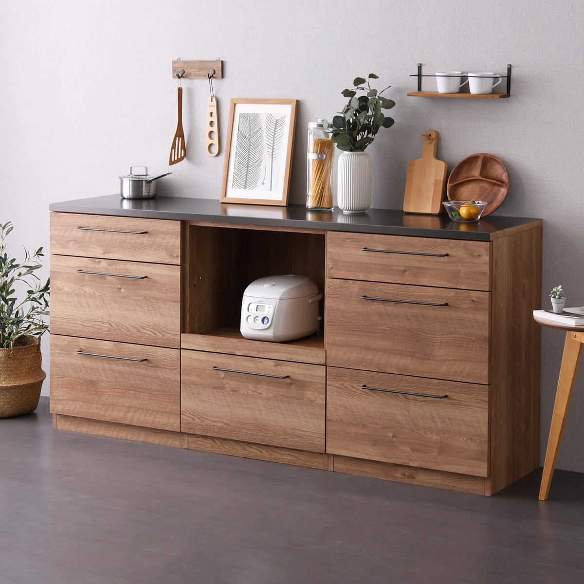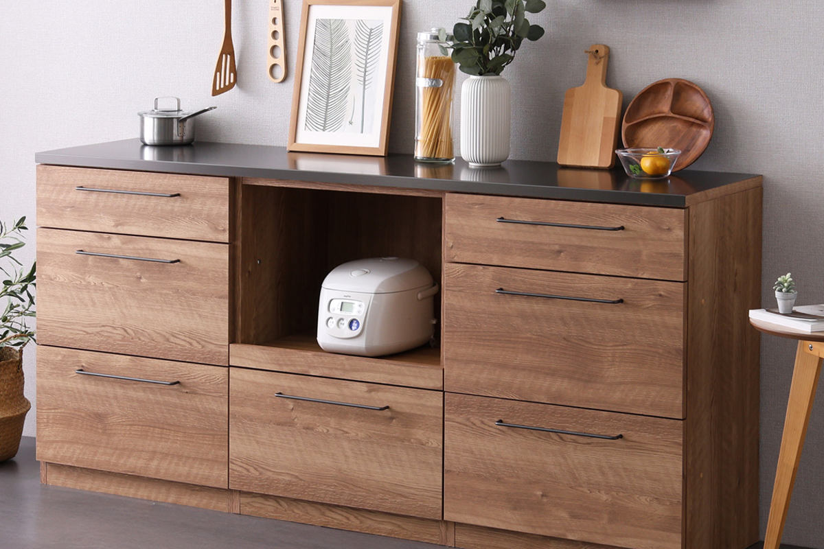炊飯器や電気ケトルなどのキッチン家電を置くのに便利なスライド棚付きです。手前に引き出せるためフタの開閉や操作がしやすく、蒸気がこもりにくいのもポイントです。使わないときはすっきり収まり、キッチンを広く使えます。