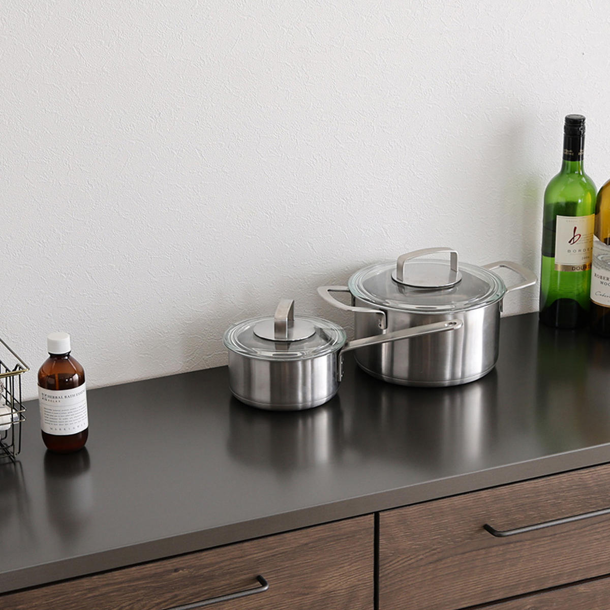 特殊加工を施した鋼板天板を採用しています。継ぎ目のないフラット設計で広々使え、金属ならではのシャープな質感が、キッチン空間をすっきりとスタイリッシュに演出します。耐熱性に配慮し、指紋が付きにくく薬品にも強い、機能面にも優れた仕様です。
