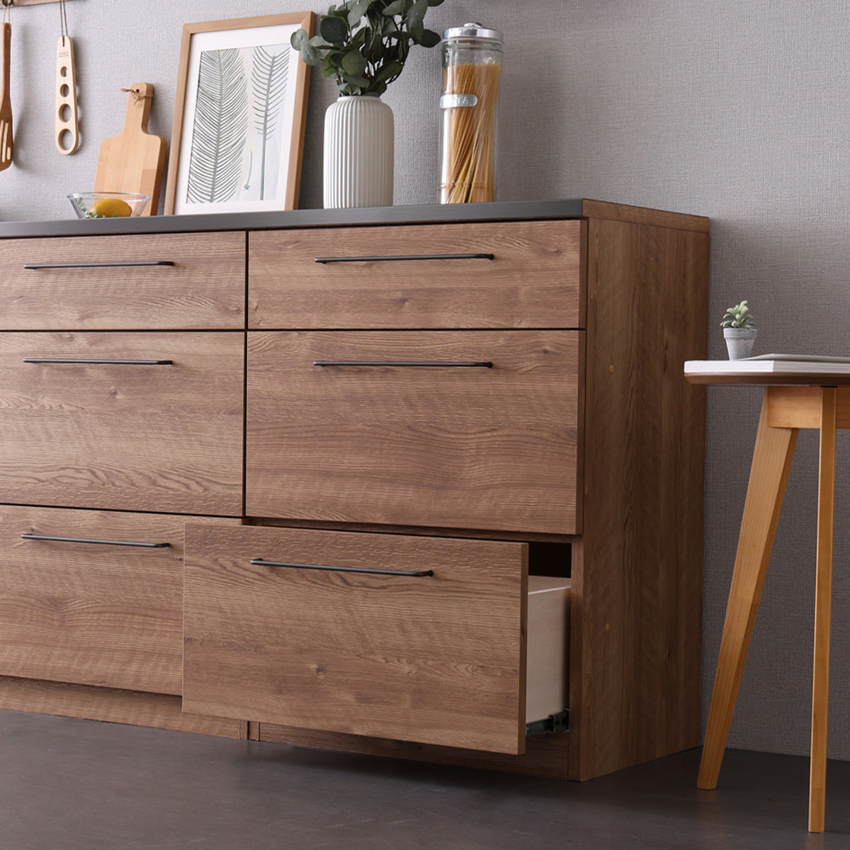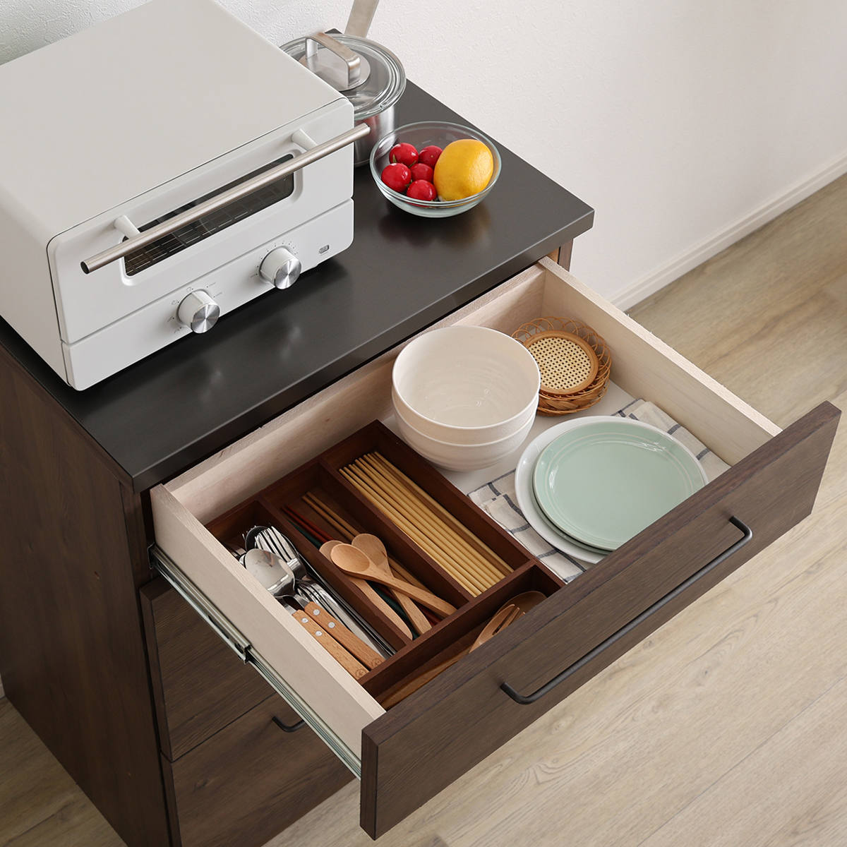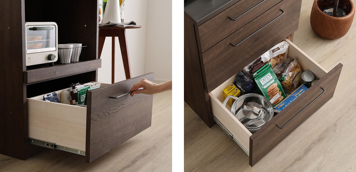 引出し収納棚は浅型が1杯、深型が2杯の計3杯の引き出し収納を備え、カトラリーや調理小物、食品ストックまでまとめて収納するのに便利です。