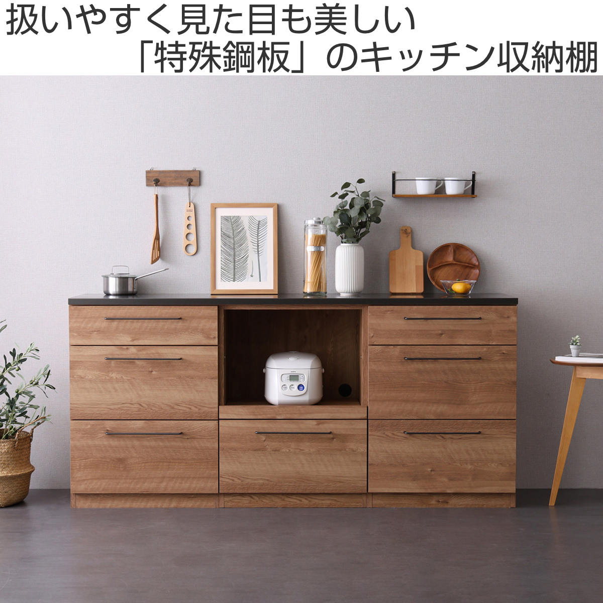 キッチンカウンター 幅180cm 3点セット レンジ台 チェスト 日本製 完成品 特殊鋼板 スライド棚 キッチン収納