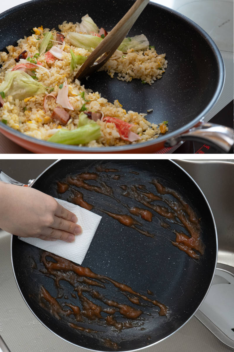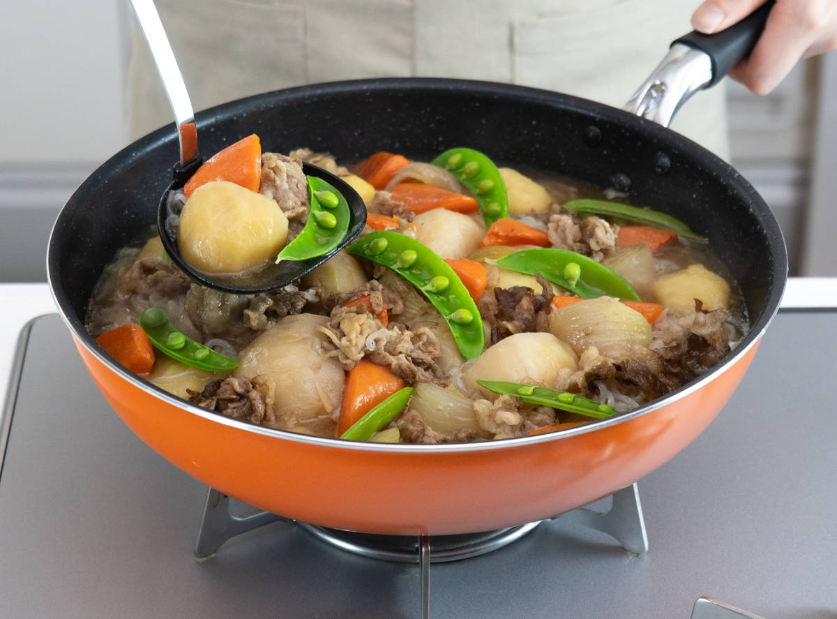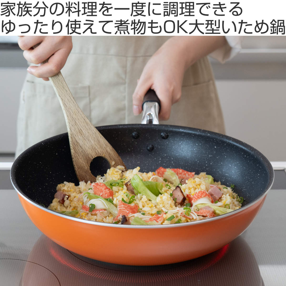 直径30cmの広い調理面で、食材をゆったり並べて調理できます。深型設計で、フライパンより具材がたっぷり入ります。チャーハンなら一度に約4人前を調理でき、家族分の料理もスムーズです。深さがあるので具材の多い炒め物もこぼれにくく、肉じゃがなど作り置きおかずの調理にも活躍します。
