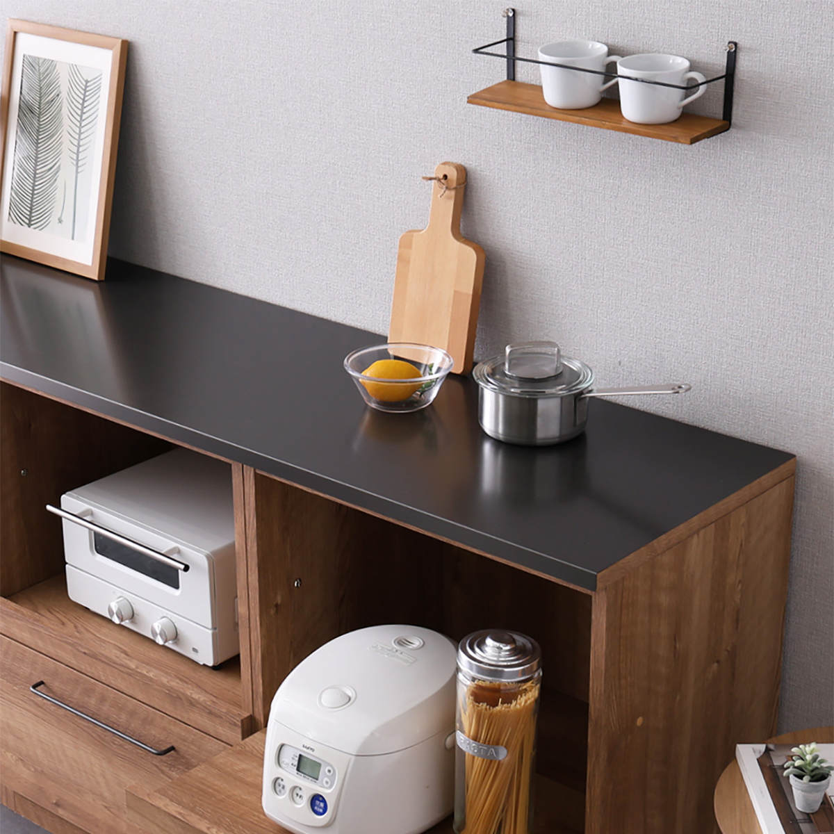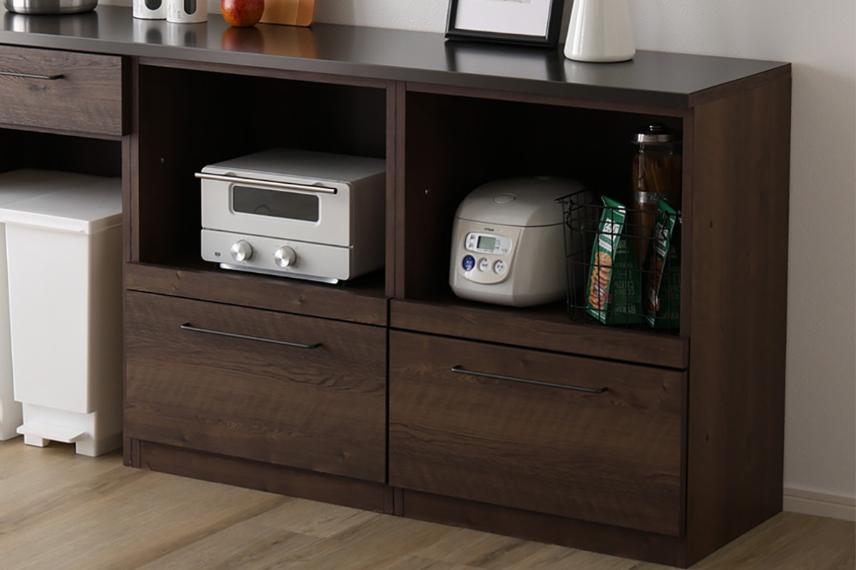 炊飯器や電気ケトルなどのキッチン家電を置くのに便利なスライド棚付きです。手前に引き出せるためフタの開閉や操作がしやすく、蒸気がこもりにくいのもポイントです。