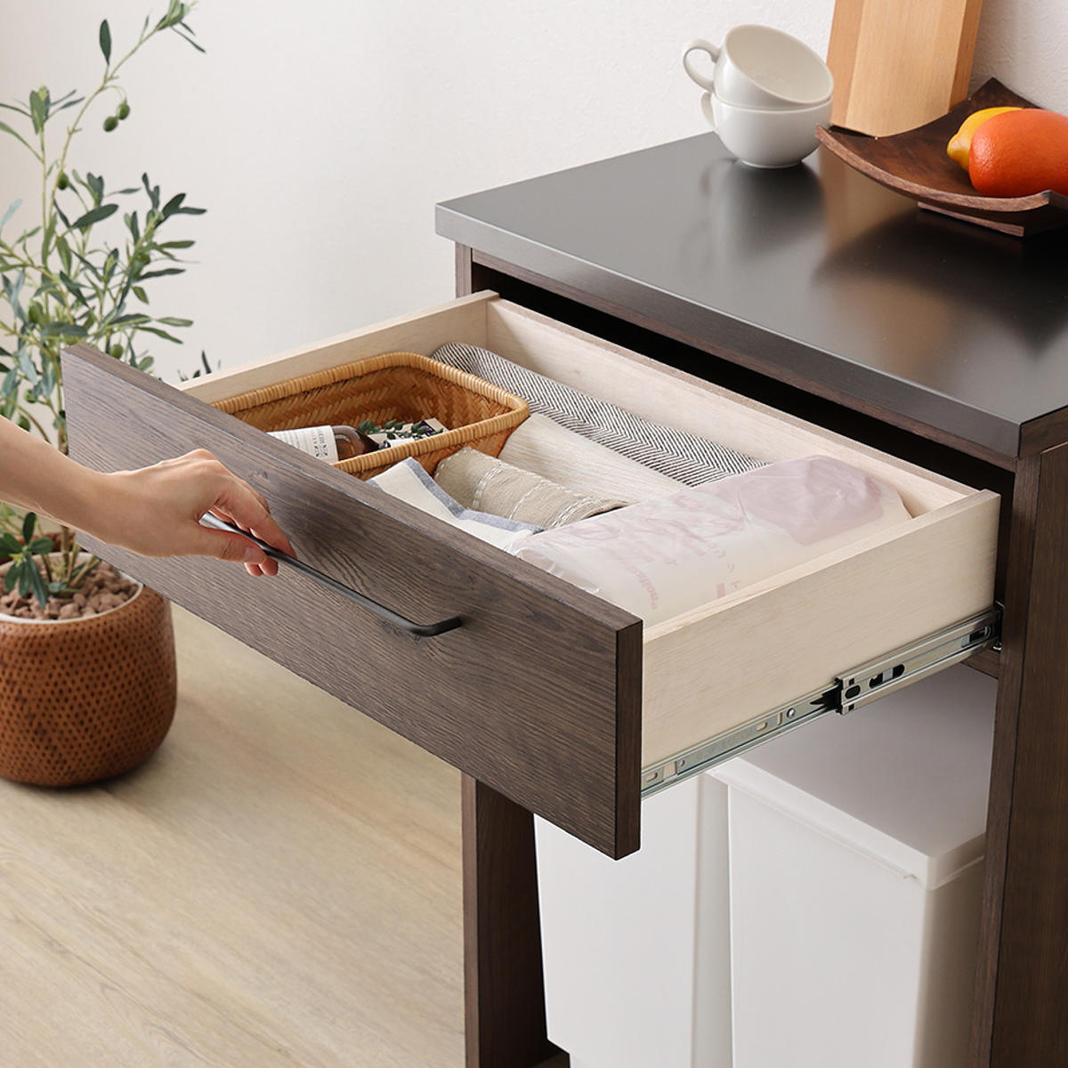 浅型の引き出しは一目で何が収納されているのか分かりやすいので、毎日使う食器やキッチン小物の収納に便利です。