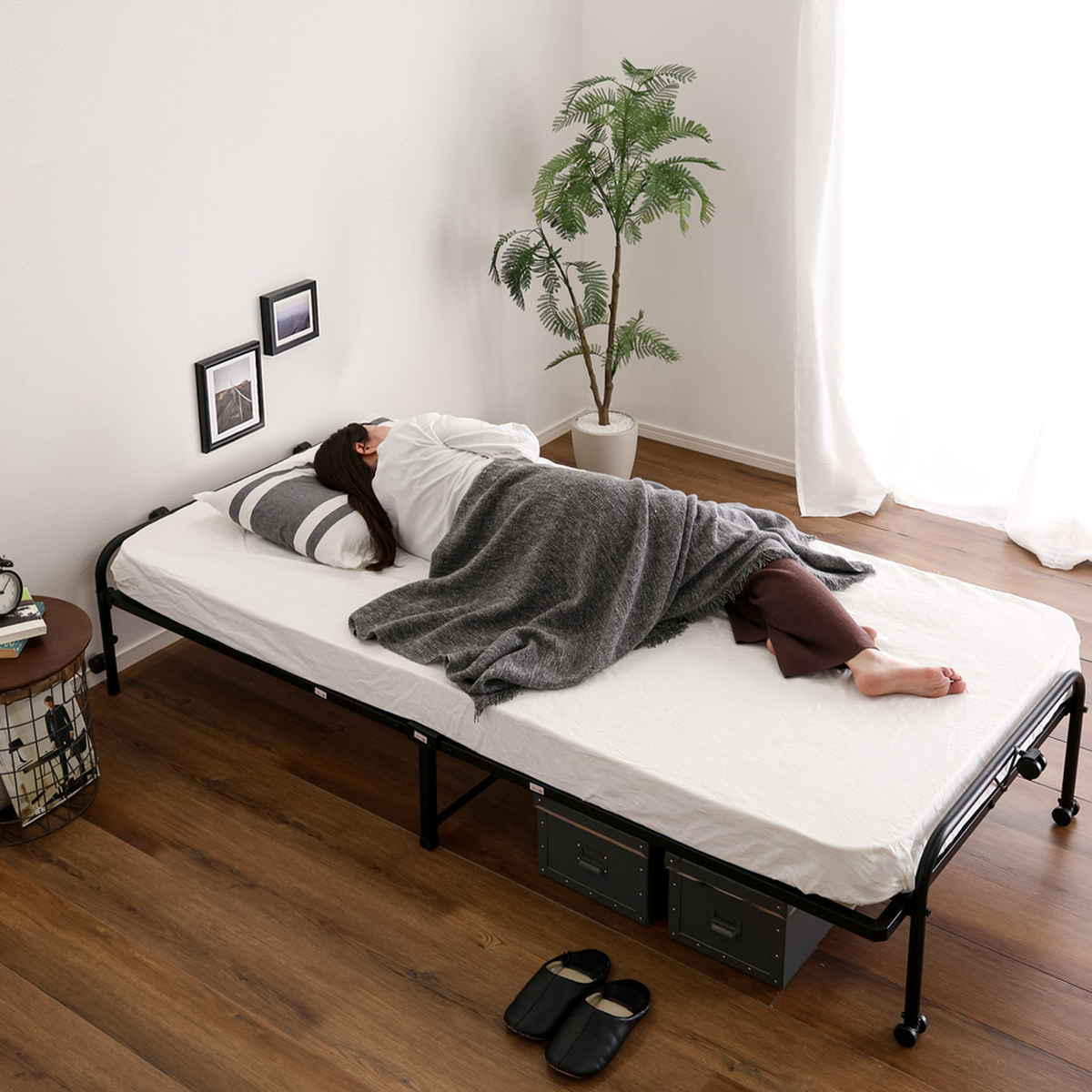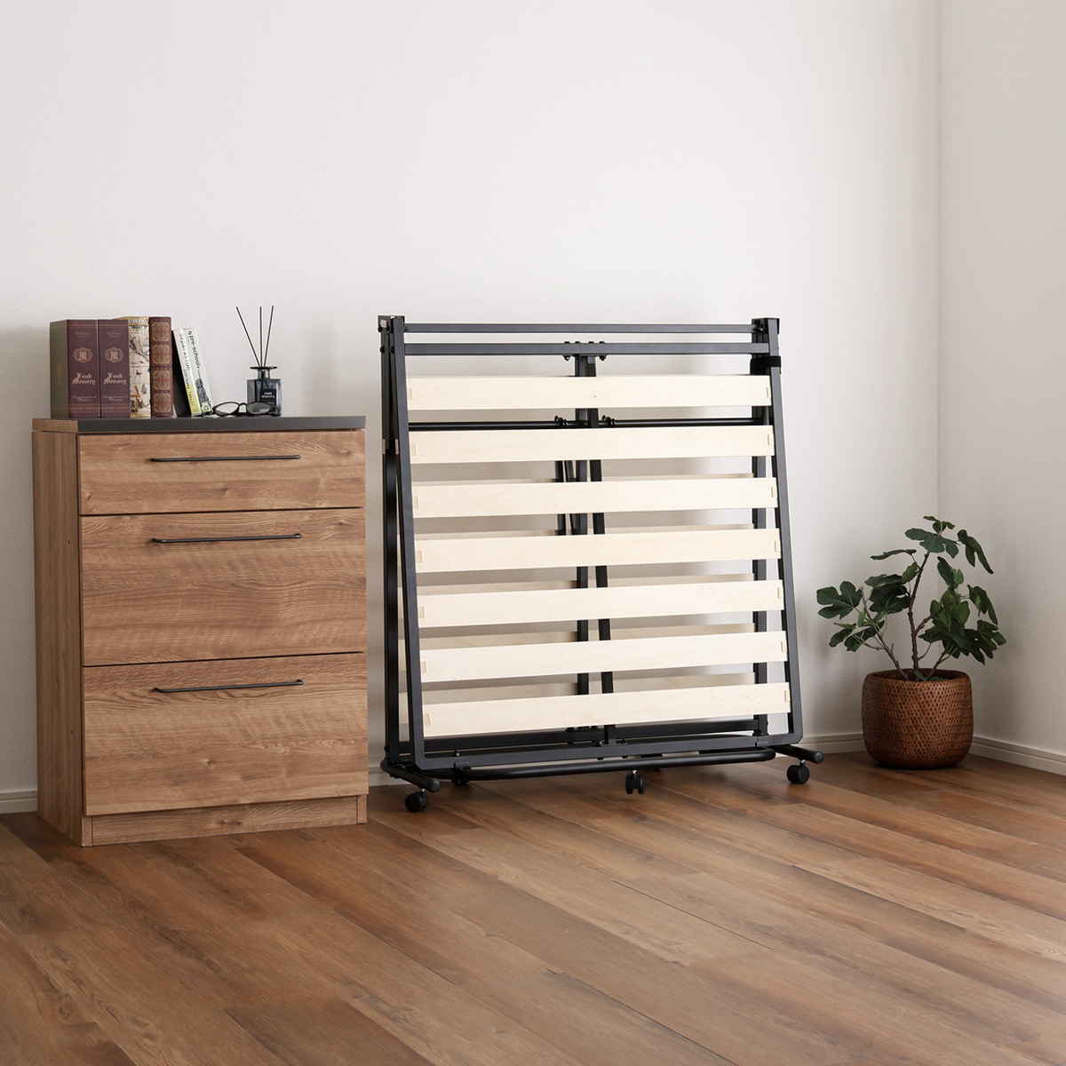 使わないときは折りたたんで省スペースに収納できます。自立するので収納場所を選ばず、来客用ベッドとしても活躍します。