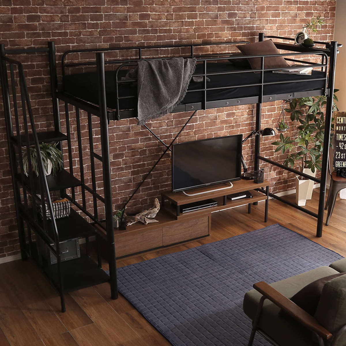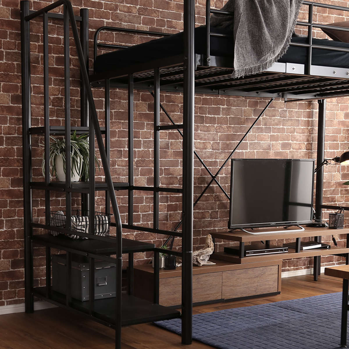 一人暮らしやワンルームなどスペースが十分に取れないお部屋におすすめのロフトベッド。ベッド下に新しい空間を作り出せるので、ソファやテレビを置くことができます。デスクやテーブルを入れても、勉強やワーキングスペースとして十分に使える広さで、スペースを上手に使うことができます。