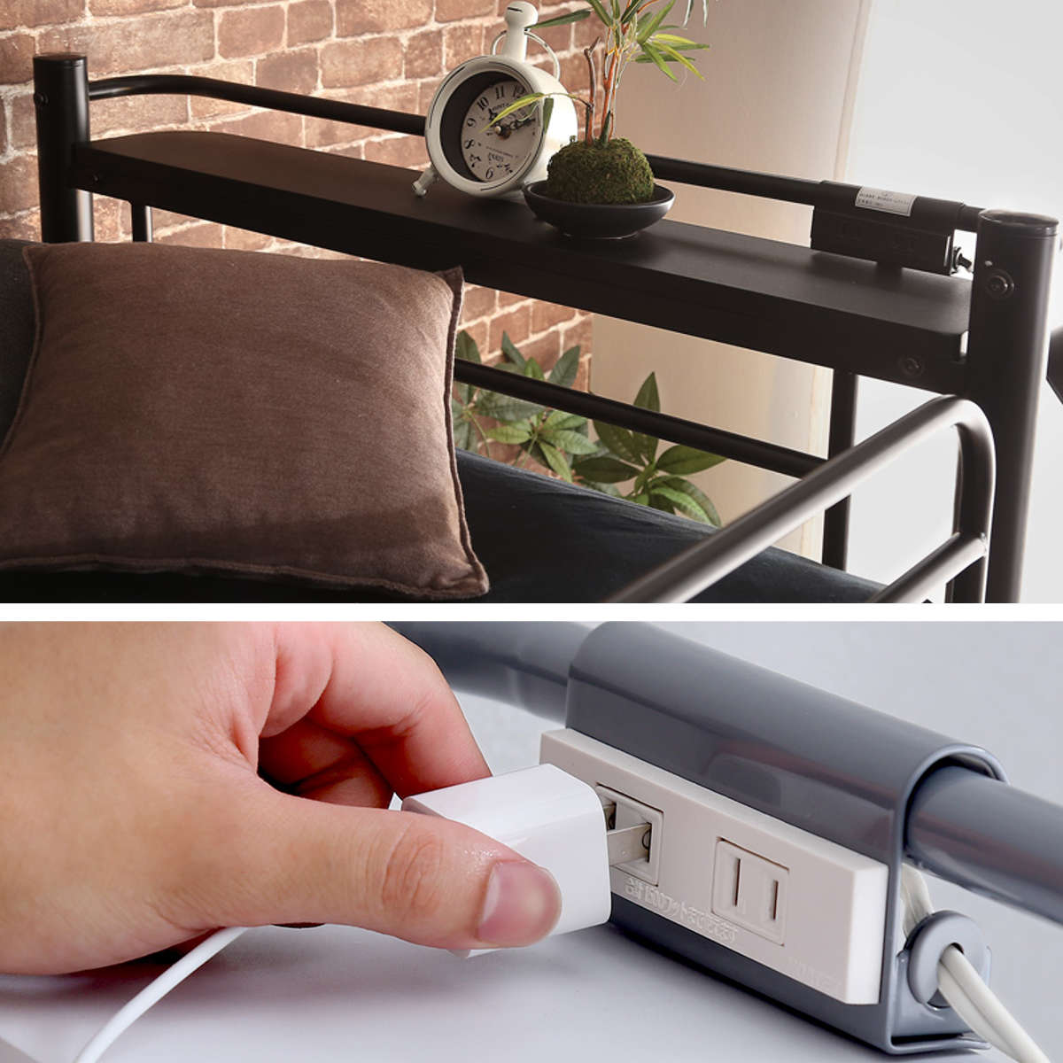 コンセント付き宮棚で枕元が便利に