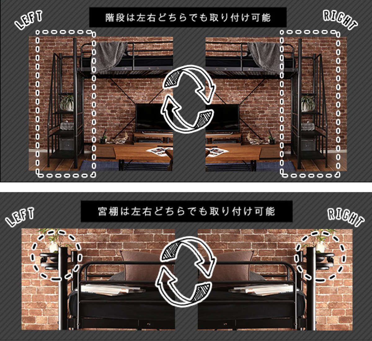 階段と宮棚は左右どちらにも取り付けが可能。壁の位置や動線を邪魔しにくく、限られたスペースでもレイアウトが自由自在です。模様替えや引っ越しの際もお部屋に合わせて組み変えらえるので、長くお使いいただけます。