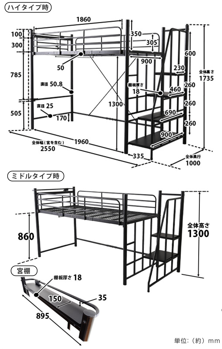 | サイズ | ハイタイプ時:約 幅255×奥行100×高さ173.5(cm) ミドルタイプ時:約 幅255×奥行100×高さ130(cm) |