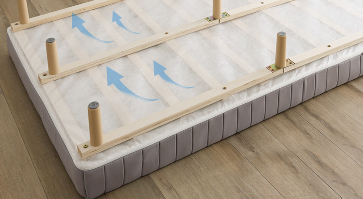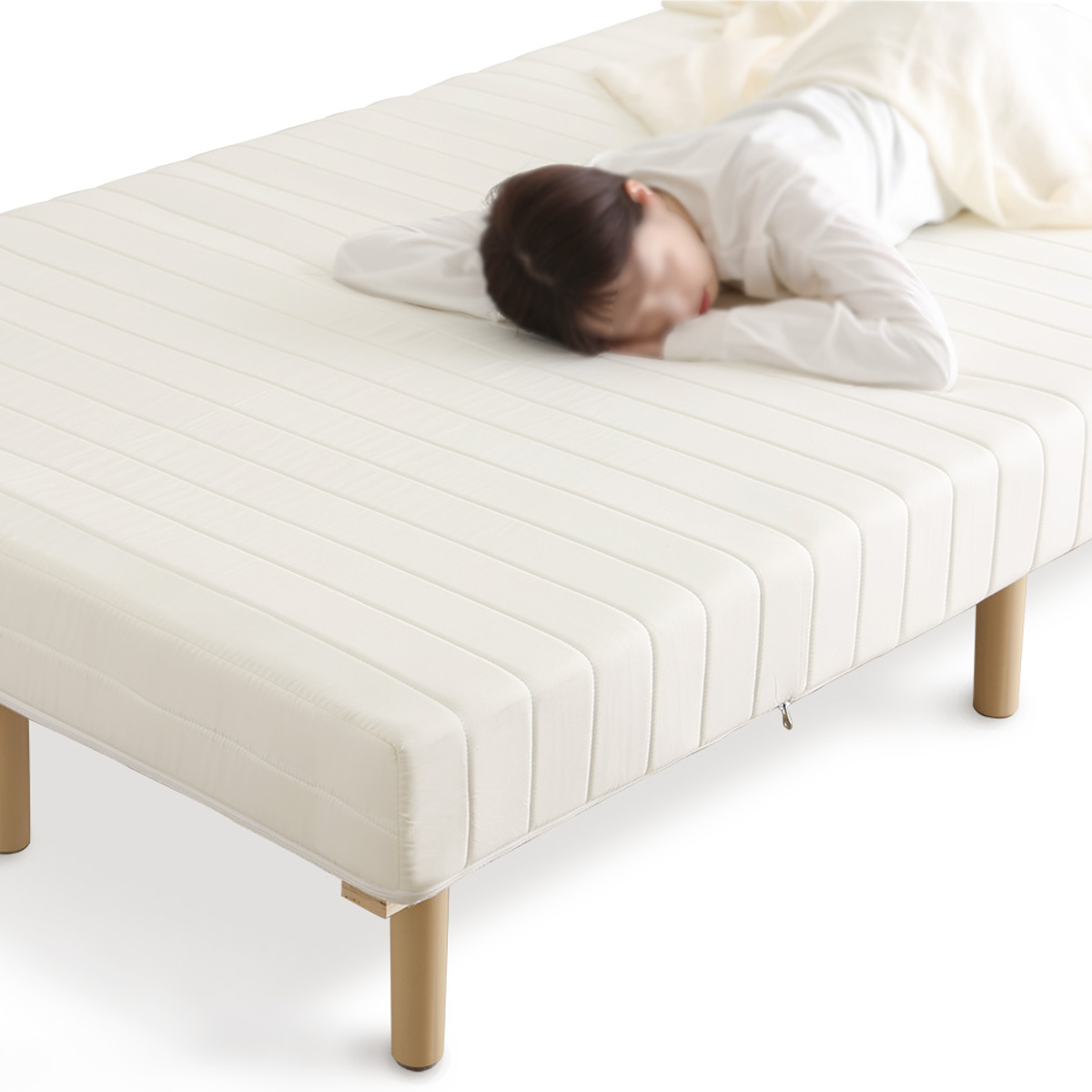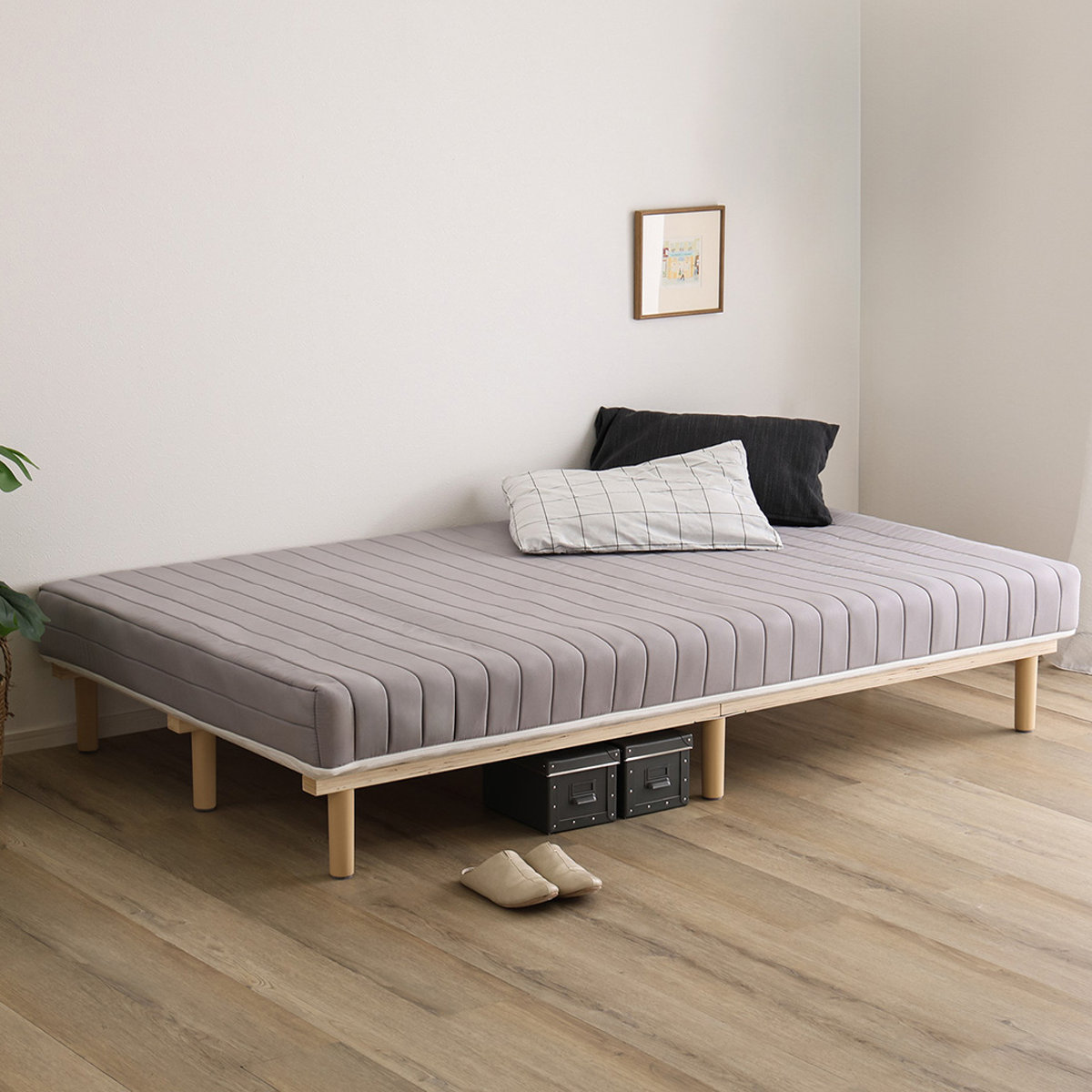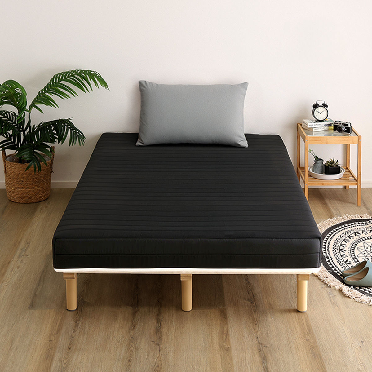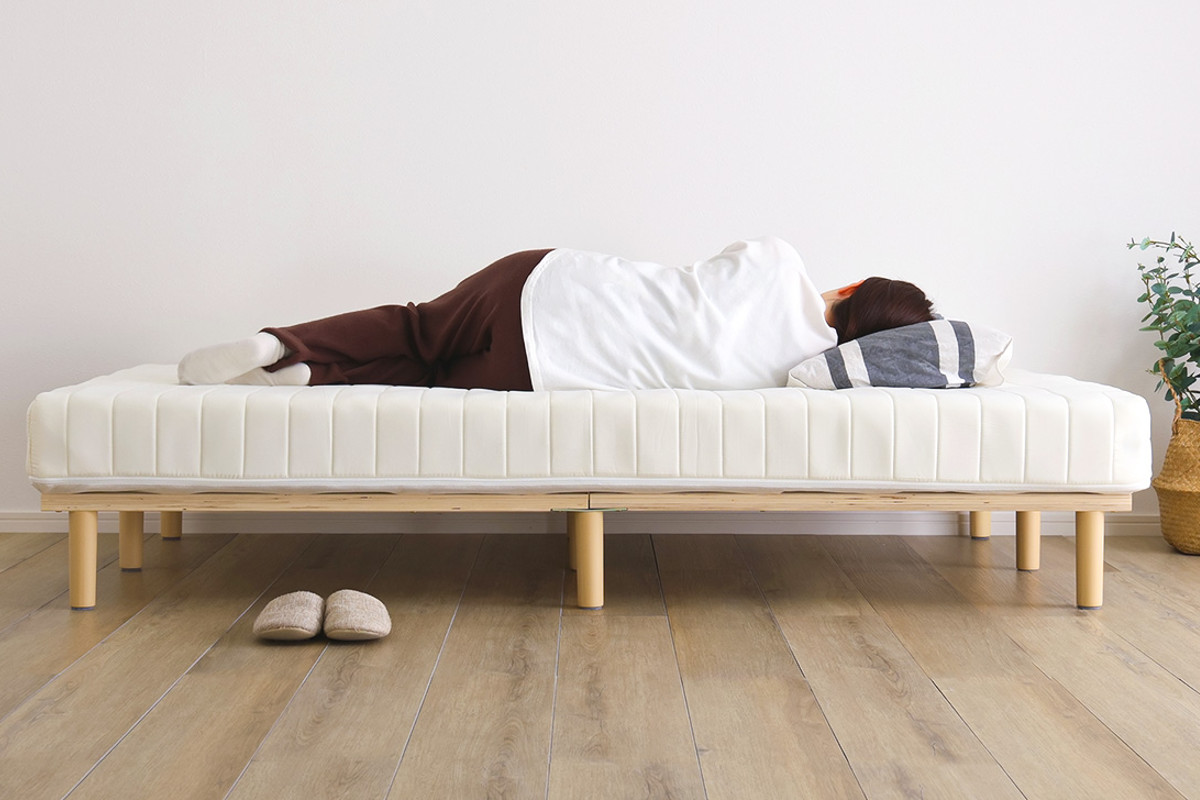 継ぎ目のない、一体型の脚付きマットレスです。良質なマットレスと通気性の良いすのこベッドを一体化した、シンプルに暮らしたい人にぴったりなミニマルデザインです。フレームがないシンプルな構造なので、場所を取らずに設置できます。