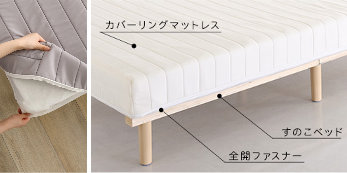 カバーはさらっとした肌触りのキルティング生地です。全開ファスナーで取り外しやすく、ネットに入れて、弱水流で洗濯機洗いできるのでお手入れも簡単。いつも清潔にご使用いただけます。