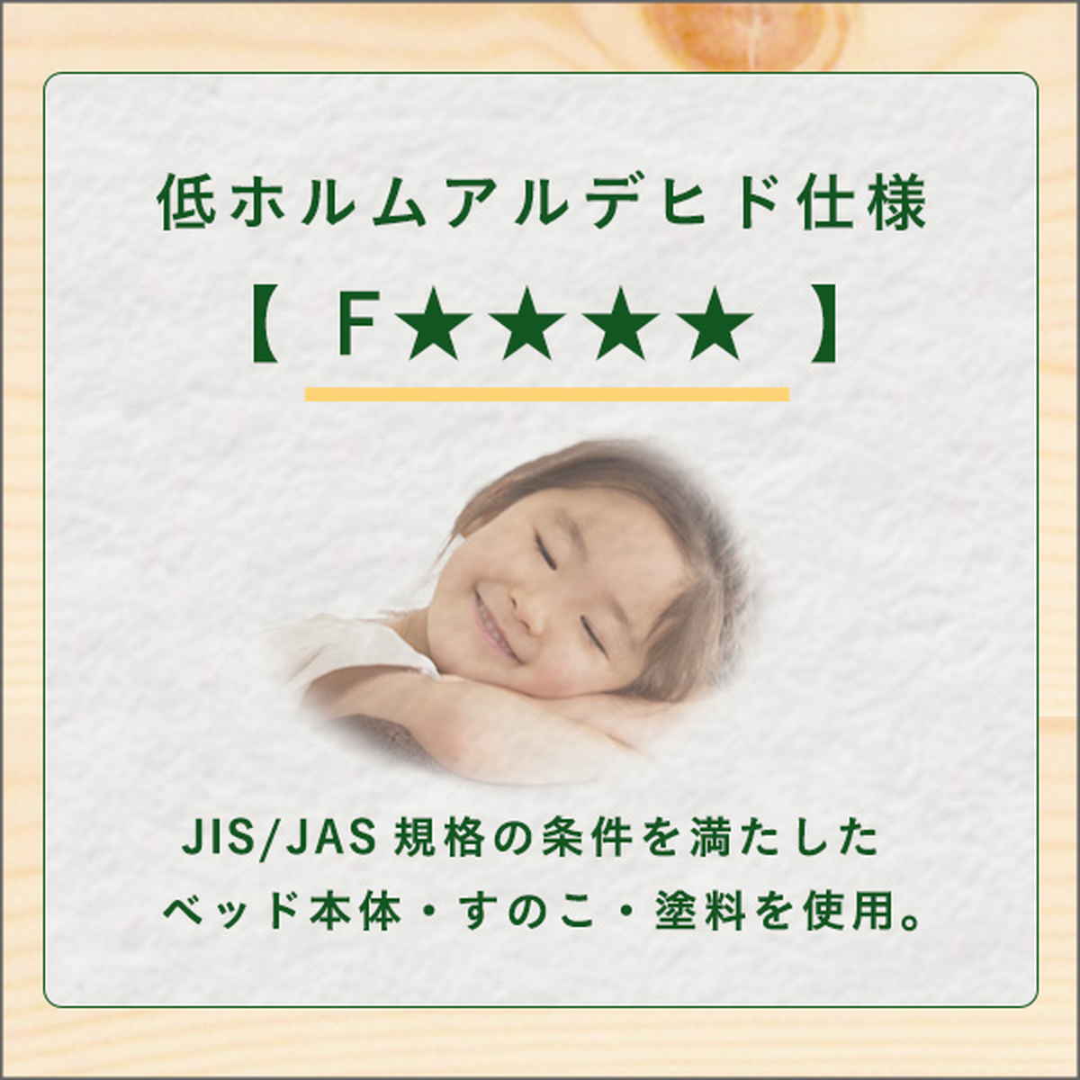 ベッド本体・すのこ・塗料すべてにおいて、JIS/JAS規格を満たしたF☆☆☆☆を取得しています。ホルムアルデヒドの放散量が最も少ない等級で、小さなお子様のいるご家庭にも安心です。