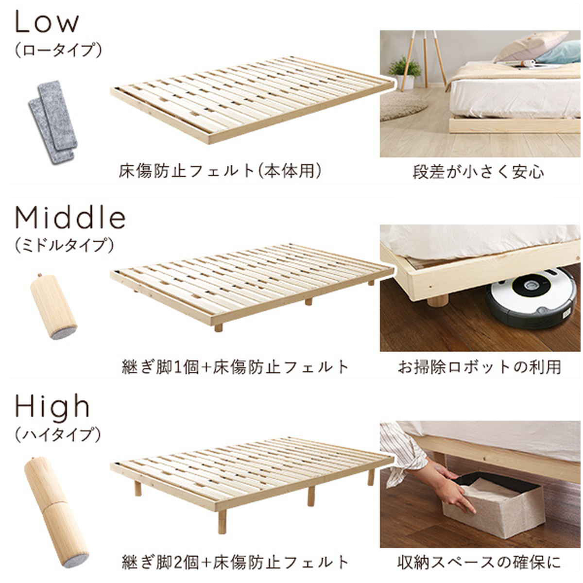 ベッド下を収納スペースとして有効活用できます。ライフスタイルやお部屋の広さに合わせて自由に調整可能です。