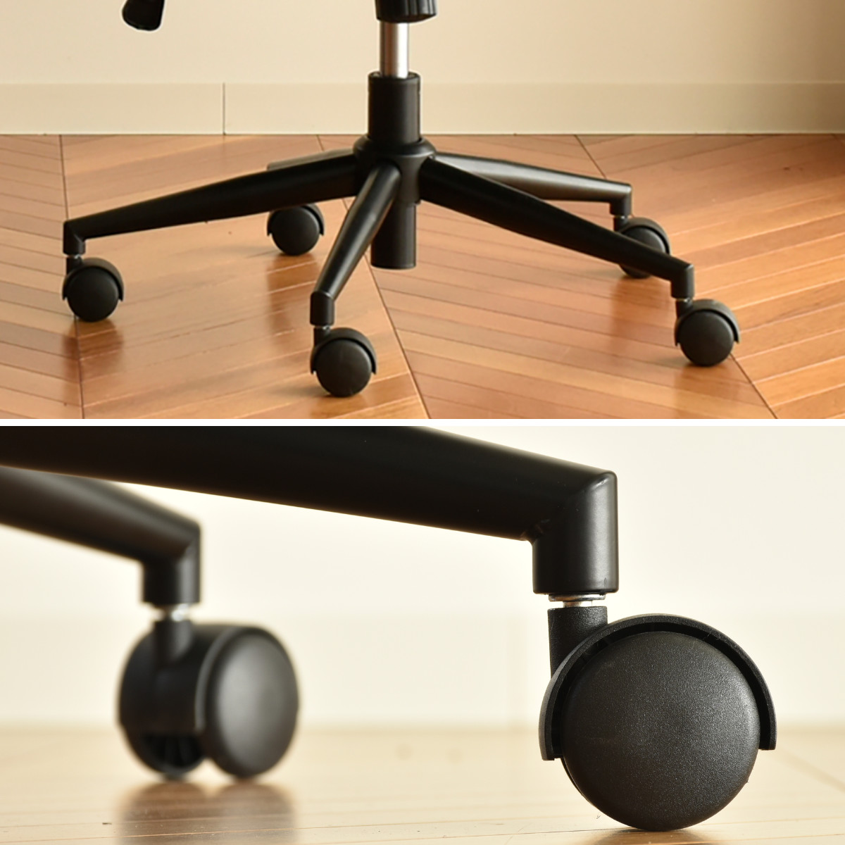 脚部にはキャスター付きで、デスク周りの移動もスムーズに行えます。