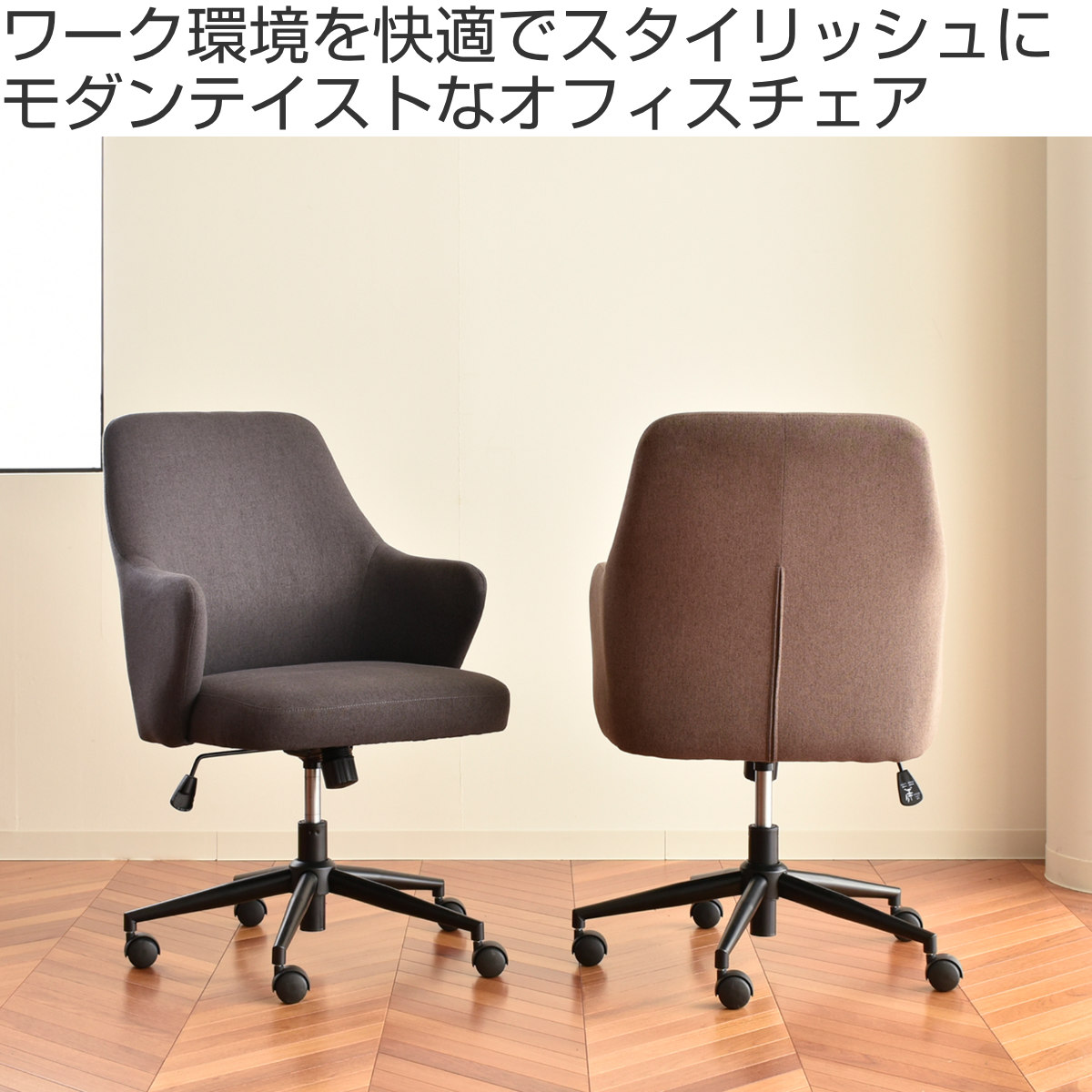 在宅ワークやオフィス環境など、様々なシーンで使いやすい昇降式でキャスター付きの機能が充実したチェアです。すっきりと無駄のないフォルムと落ち着いたトーンがモダンな印象を与え、ワークスペースをさりげなくおしゃれに整えます。