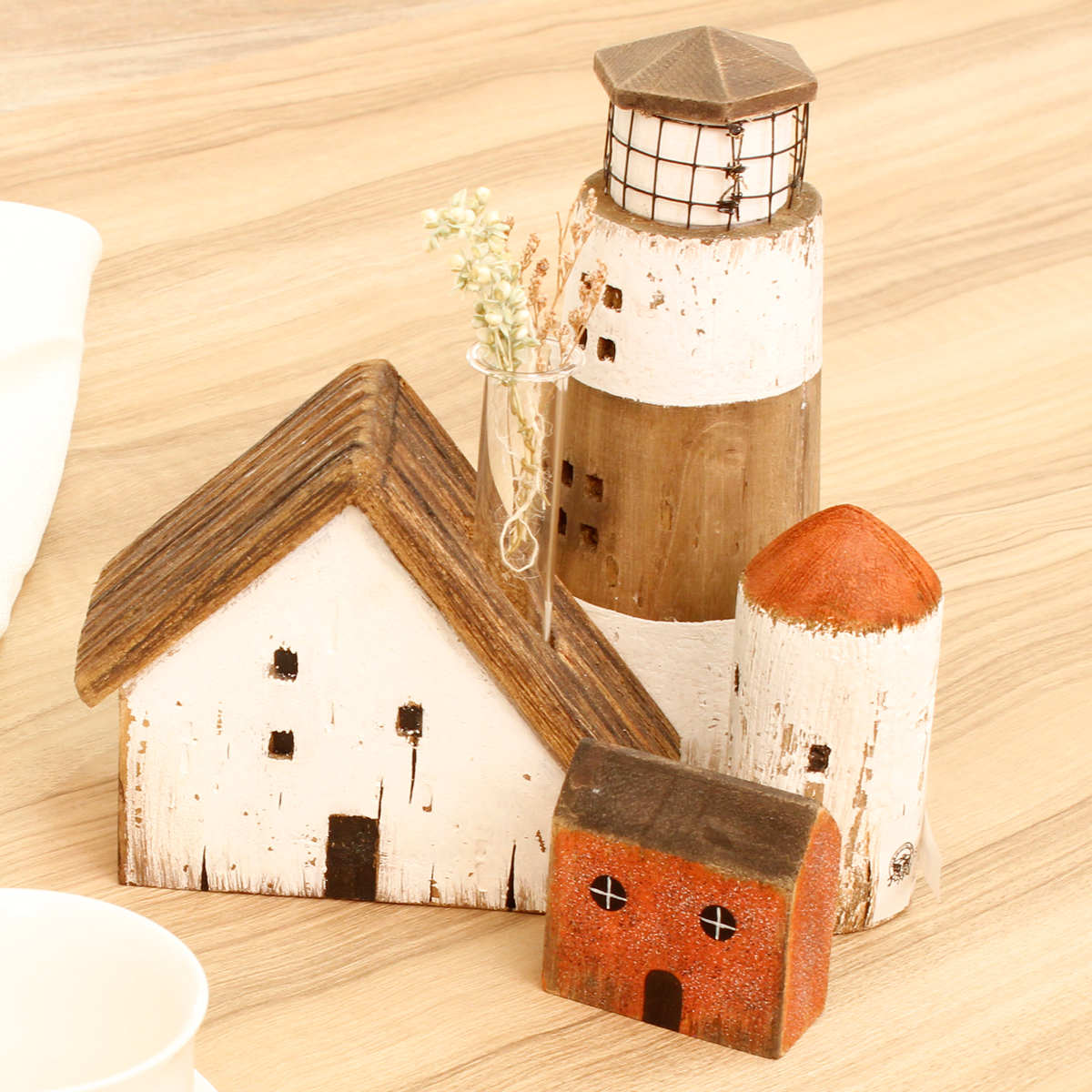 そっと飾るだけで空間のアクセントになる、素朴な風合いのオブジェたち。かすれたペイントと木のぬくもりが、あたたかい街並みを思わせます。サイズやモチーフを少しずつ揃えれば、組み合わせるたびにあなただけの街が広がります。