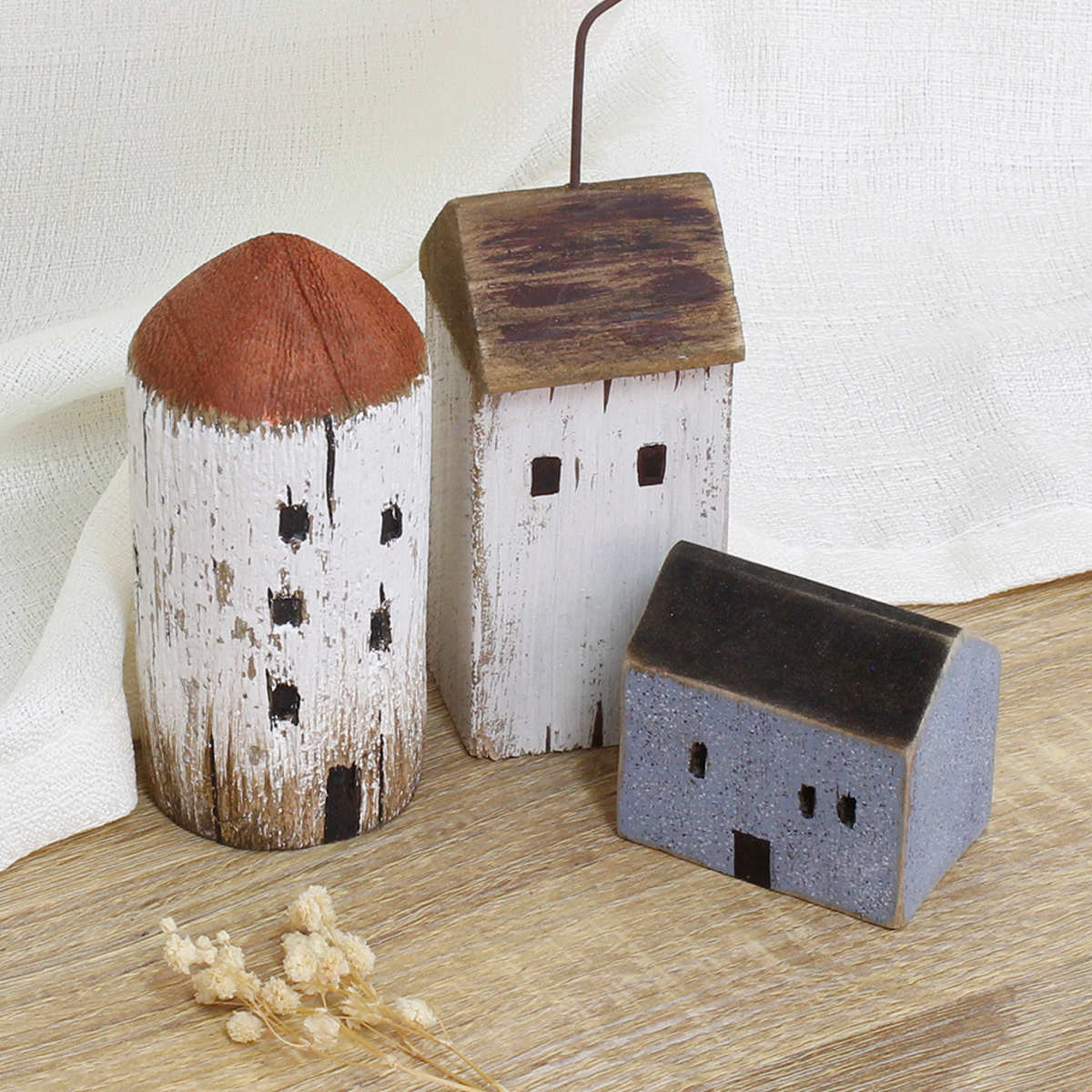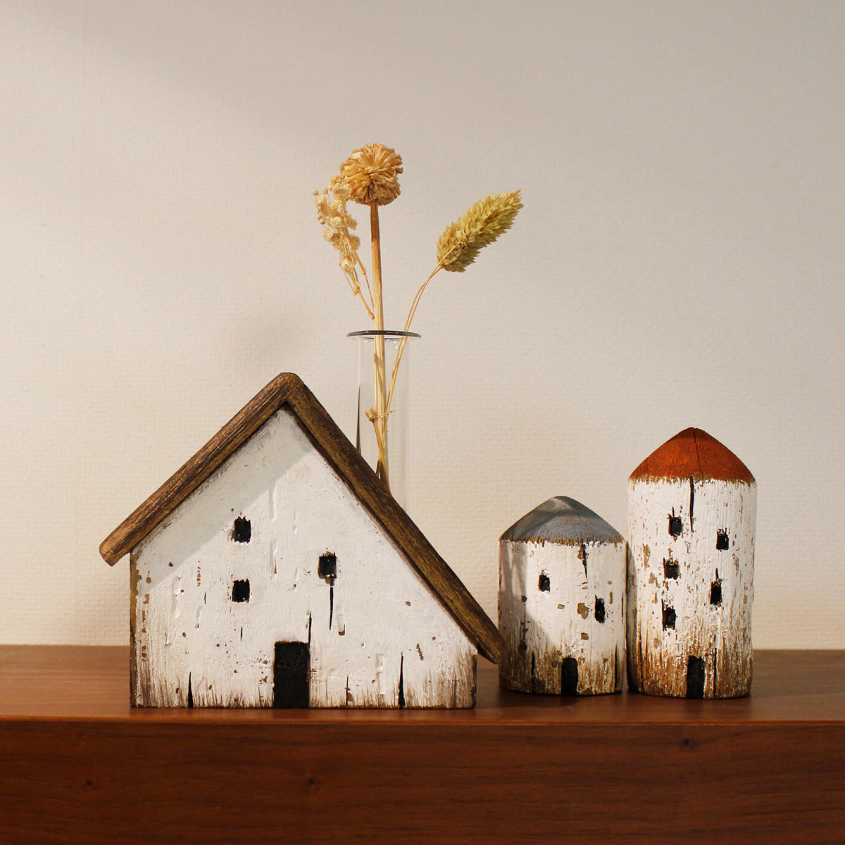 そっと飾るだけで空間のアクセントになる、素朴な風合いのオブジェたち。かすれたペイントと木のぬくもりが、あたたかい街並みを思わせます。サイズやモチーフを少しずつ揃えれば、組み合わせるたびにあなただけの街が広がります。