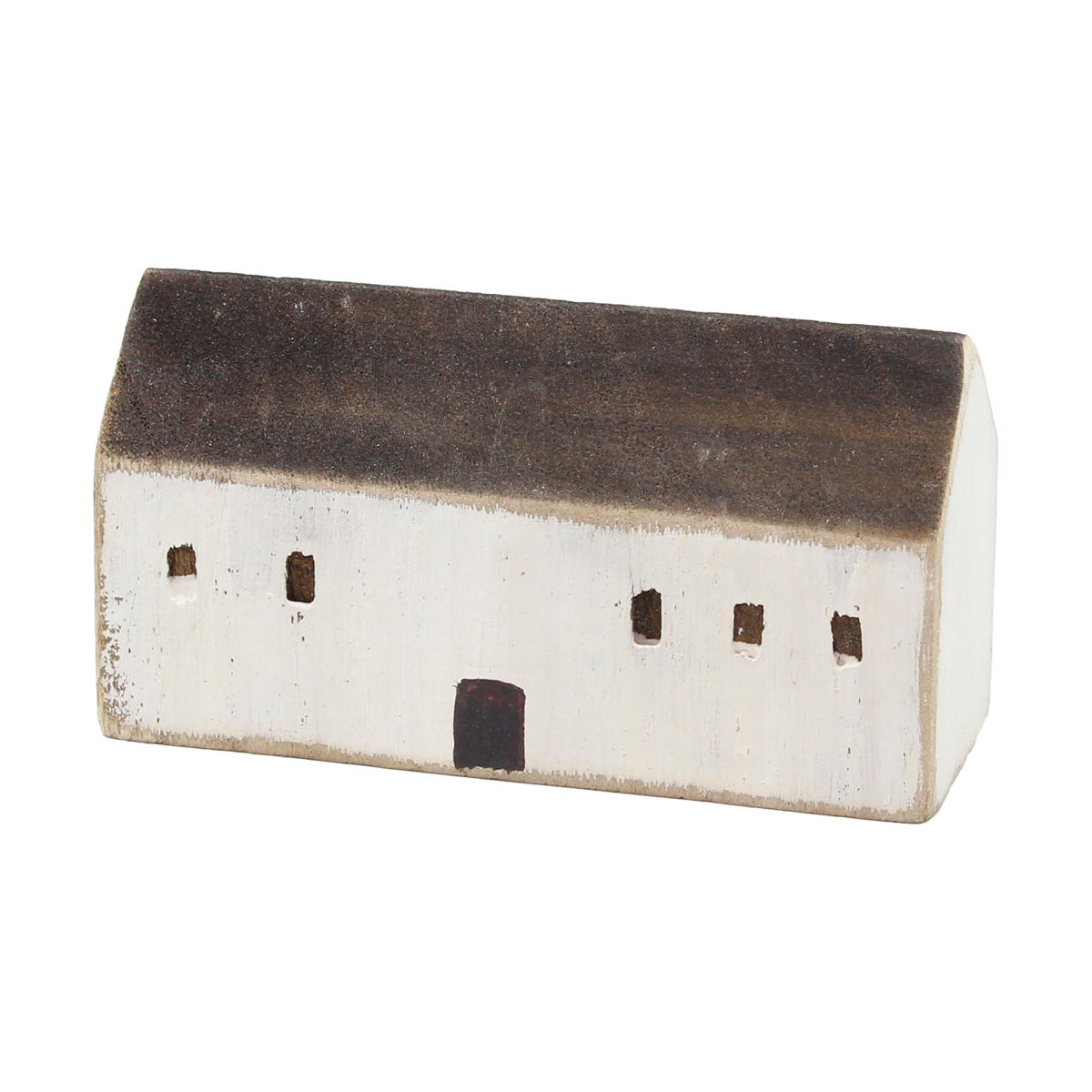 落ち着いた雰囲気で空間に溶け込む、素朴さが魅力の木製オブジェです。横長のフォルムと並んだ小窓が印象的で、飾るだけでさりげない存在感を添えてくれます。