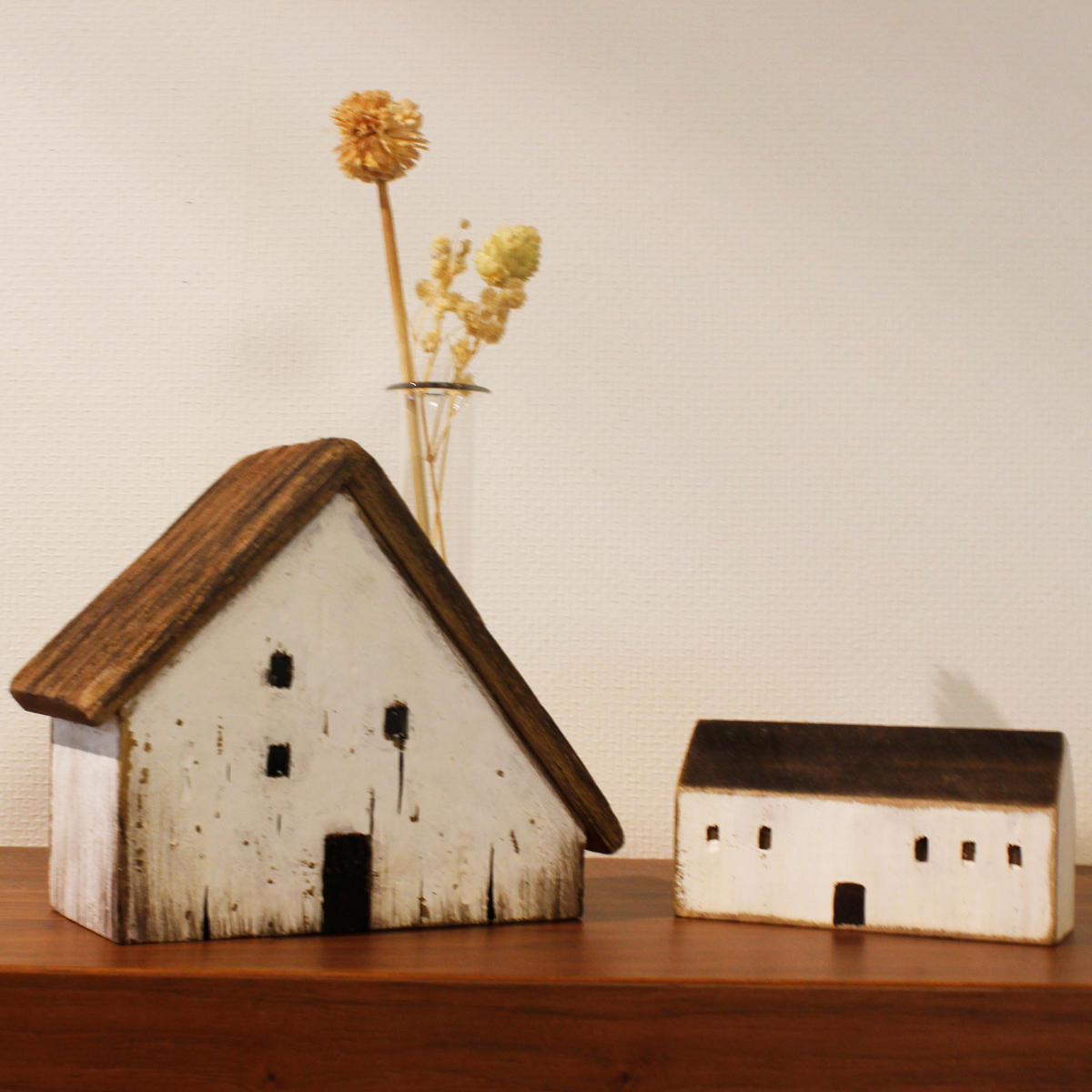 そっと飾るだけで空間のアクセントになる、素朴な風合いのオブジェたち。かすれたペイントと木のぬくもりが、あたたかい街並みを思わせます。サイズやモチーフを少しずつ揃えれば、組み合わせるたびにあなただけの街が広がります。