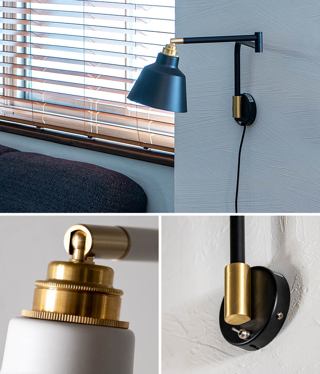 細身のアームがすっきりと伸びる、おしゃれなウォールライトです。マットな質感のアームに真鍮製のソケットカバーを組み合わせ、スタイリッシュかつ上品さを感じるデザインに仕上げました。モノトーンでまとめたお部屋やヴィンテージな雰囲気とも相性が良く、レストランやカフェのような空間づくりにもぴったりです。