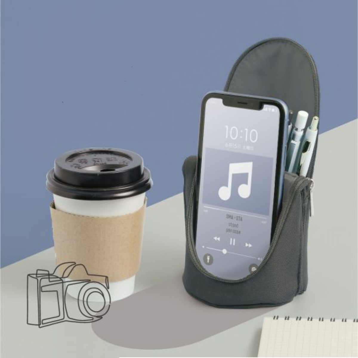 ケースを開くと、背面に内蔵された磁石が固定されてスタンド形状になります。ワンタッチでペンスタンドに変わるので、準備の手間がかかりません。机の上でも安定して立つため、安心して使用できます。