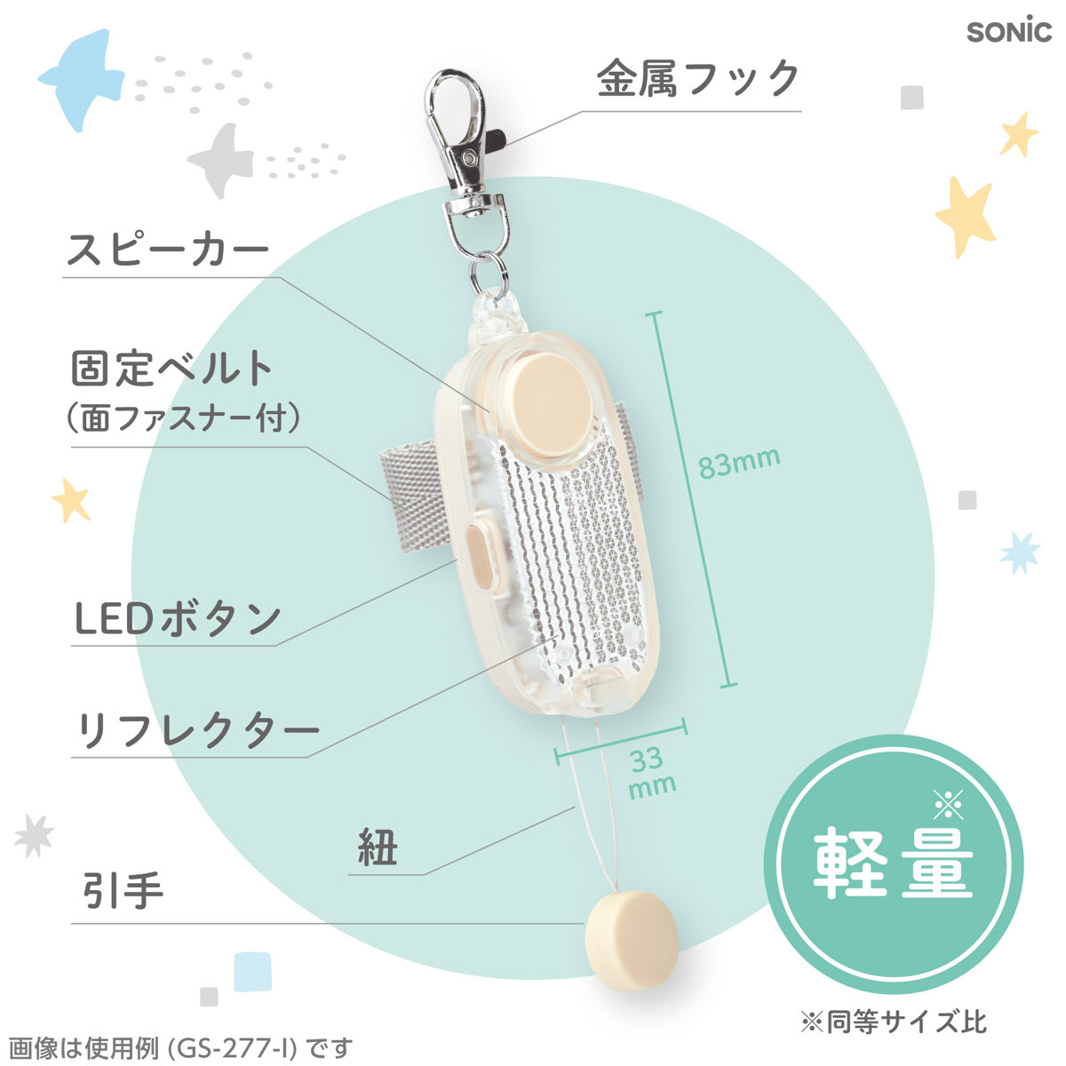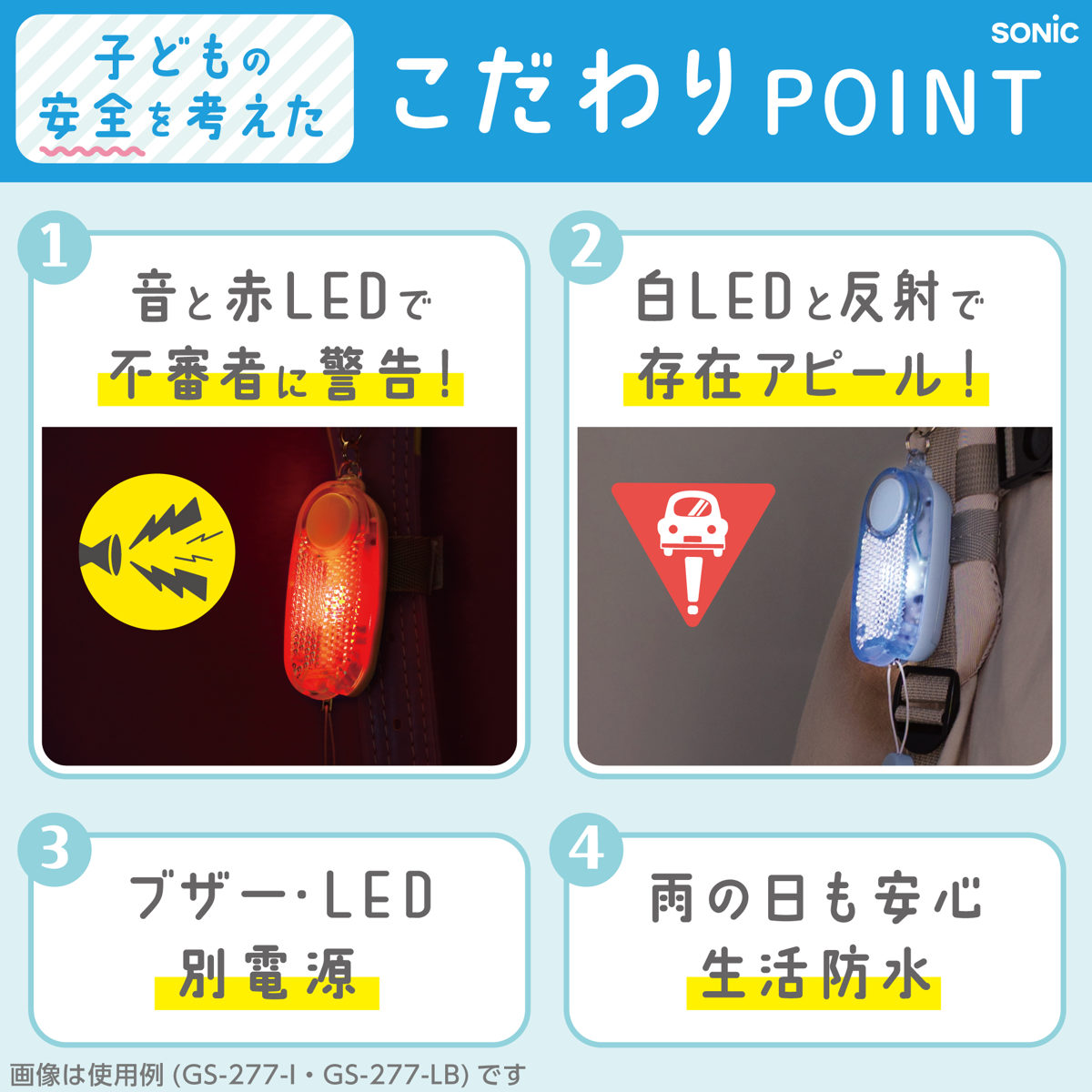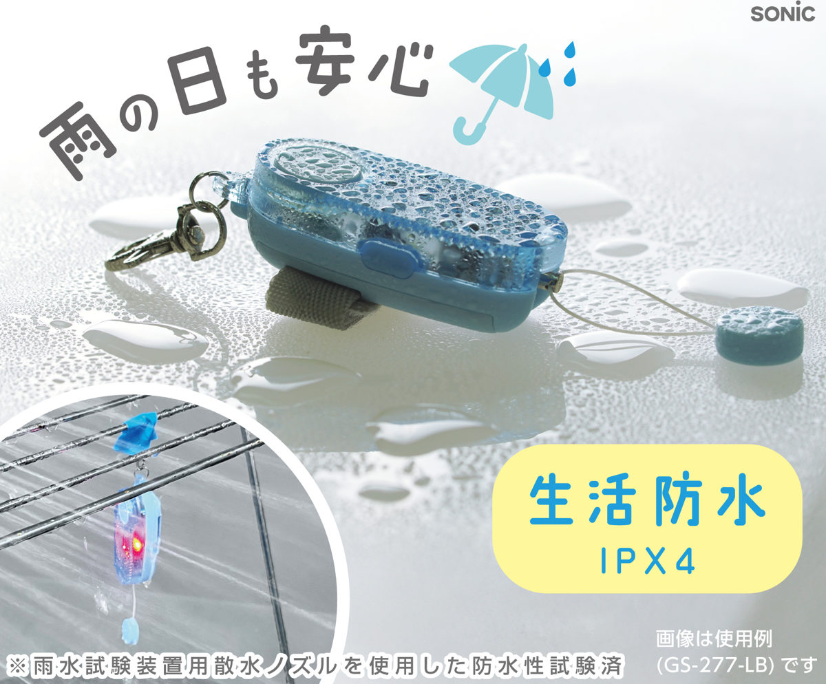 | 備考 | ■優良防犯ブザー (全国防犯協会連合会推奨第25R301号) ■生活防水(IPX4)仕様 ■音量:90dB ■LEDライト:2つの点滅モード(低速点滅・高速点滅) ■連続点滅時間:低速時約350時間/高速時約200時間 |