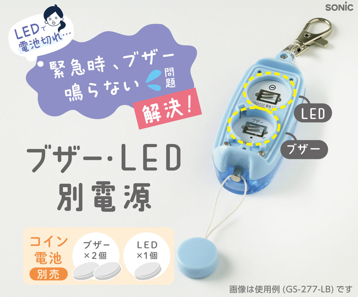 ブザーとLEDは別電源設計です。万が一LED電池が切れても、「ブザーが鳴らない」というトラブルを防ぎます。