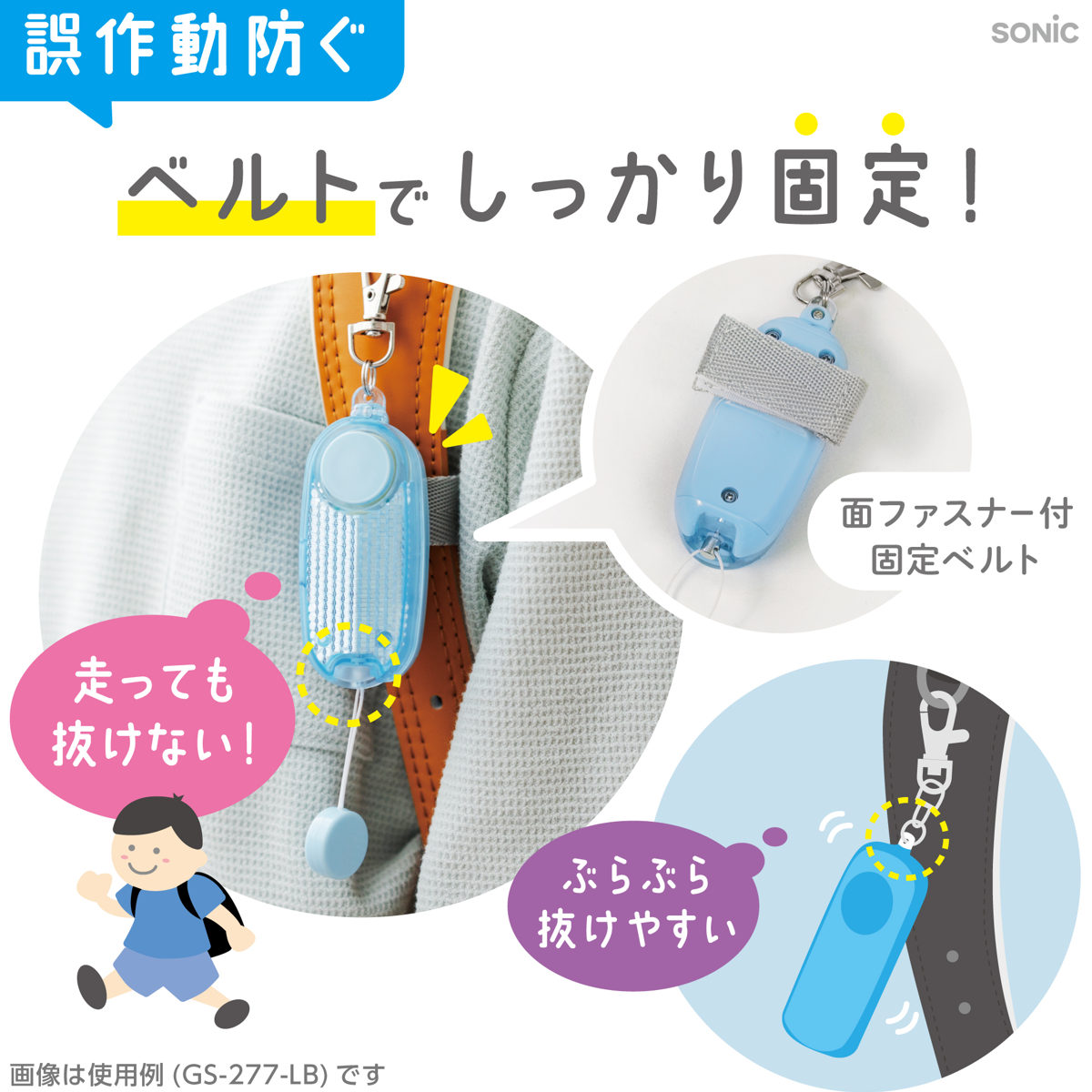 固定ベルトでランドセルやリュックにしっかり装着できます。 ピンは抜けきらない構造のため紛失しません。邪魔にならない軽量設計で、お子様でも使いやすいです。