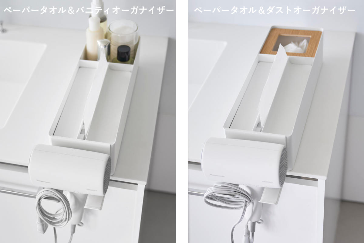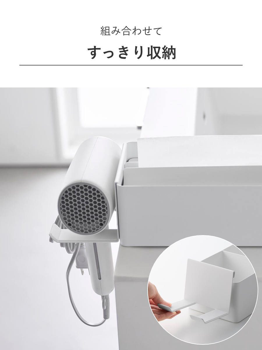 ドライヤーを別売りのペーパータオルオーガナイザーシリーズと組み合わせてすっきり収納できる、専用のホルダーです。シリーズ本体に取り付けて使える設計で、洗面まわりをより便利に整えます。