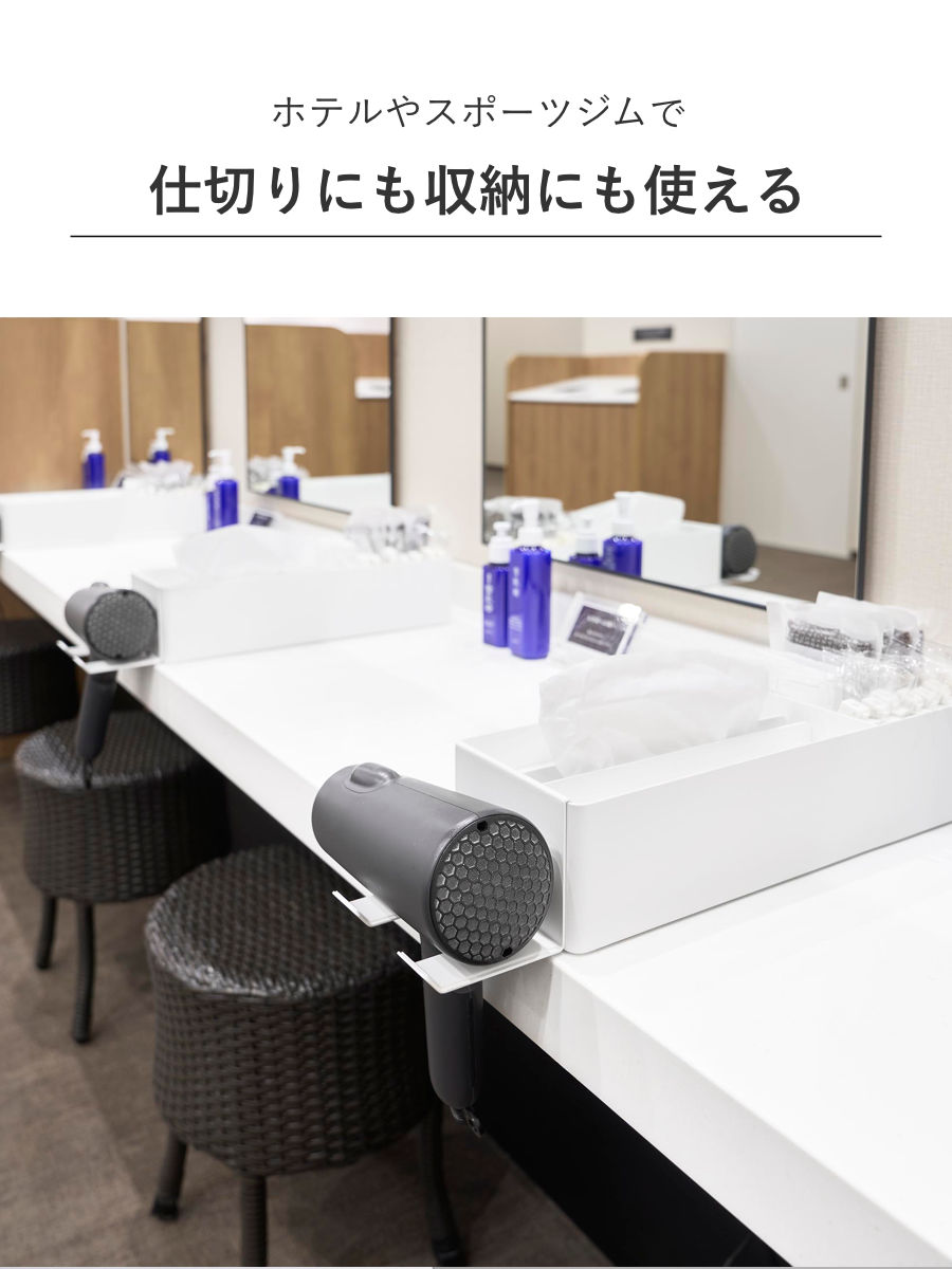 ご自宅での使用はもちろん、宿泊施設の大浴場やスポーツジムなどの共有スペースにもおすすめです。別売りのペーパータオルオーガナイザーシリーズと組み合わせることで仕切りとしても使用でき、ドライヤーの定位置を確保できます。
