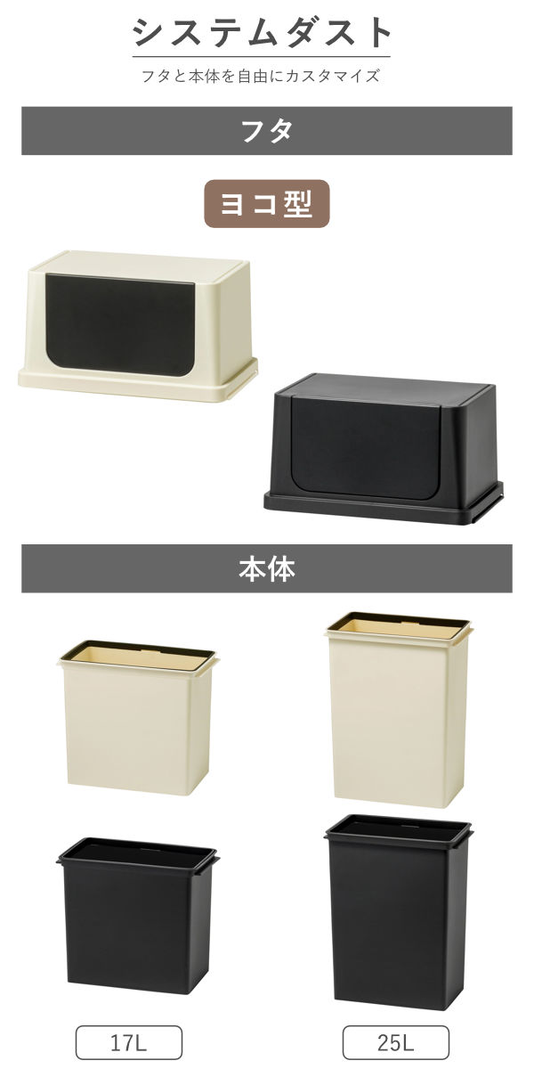 別売りの本体と組み合わせて使えるシステムダストシリーズのフタ(ヨコ型)です。用途や使い方に合わせて組み合わせを選べるので、使いやすいゴミ箱にカスタマイズできます。