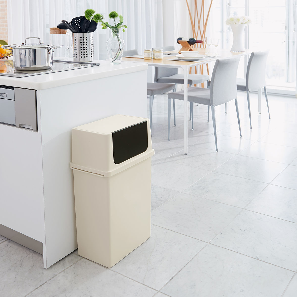 フタを軽く押すだけで開くため、片手でもゴミを入れやすく日常使いがラクです。
