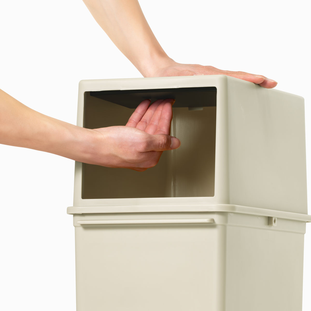 スイングするふたは天面の内側についている留め具にカチッとはめ込んで固定することも可能です。開けたままにできるので連続投入もラクに行えます。閉める際は天面を上から押し込むと元に戻ります。