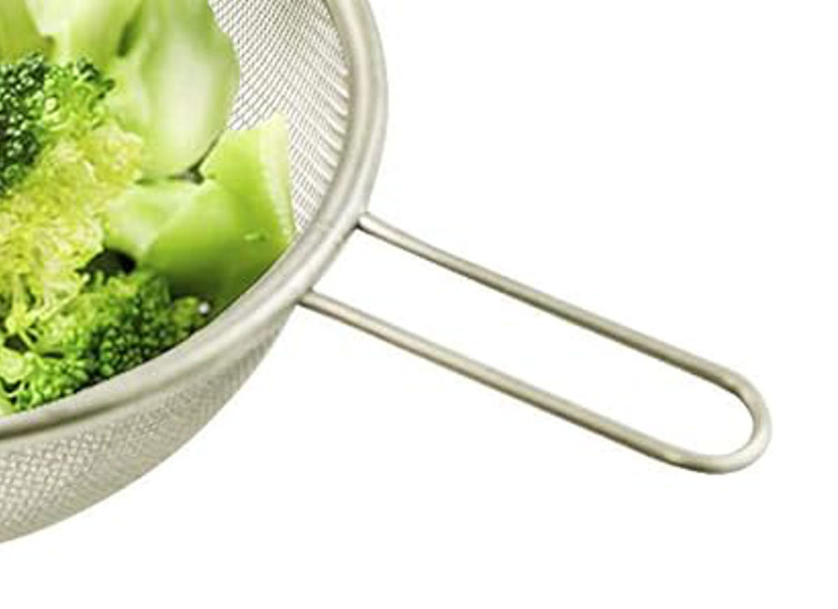 握りやすいハンドル付きで、茹でた野菜や麺の湯切りもスムーズに行えます。また、掛けて収納できるので、必要な時にすぐ使えます。