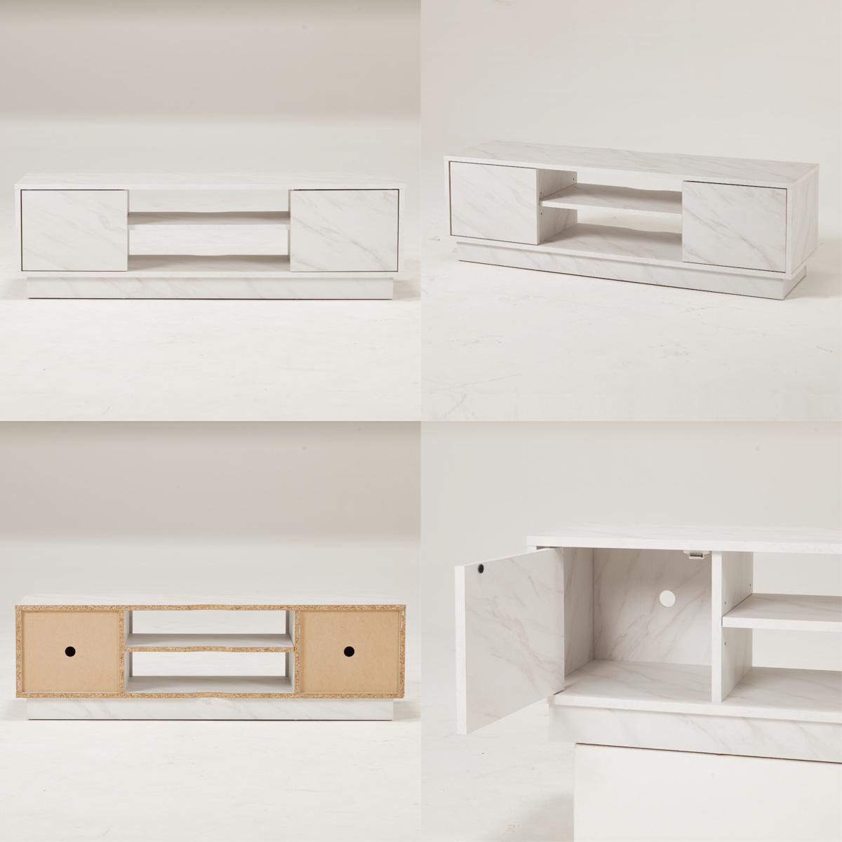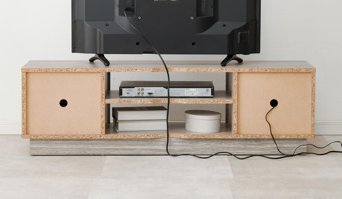 両サイドは扉で隠せる収納、中央はレコーダー類が置けるオープン仕様の棚です。オープン棚の棚板は可動式なので、3段階のお好みの高さに変えられます。