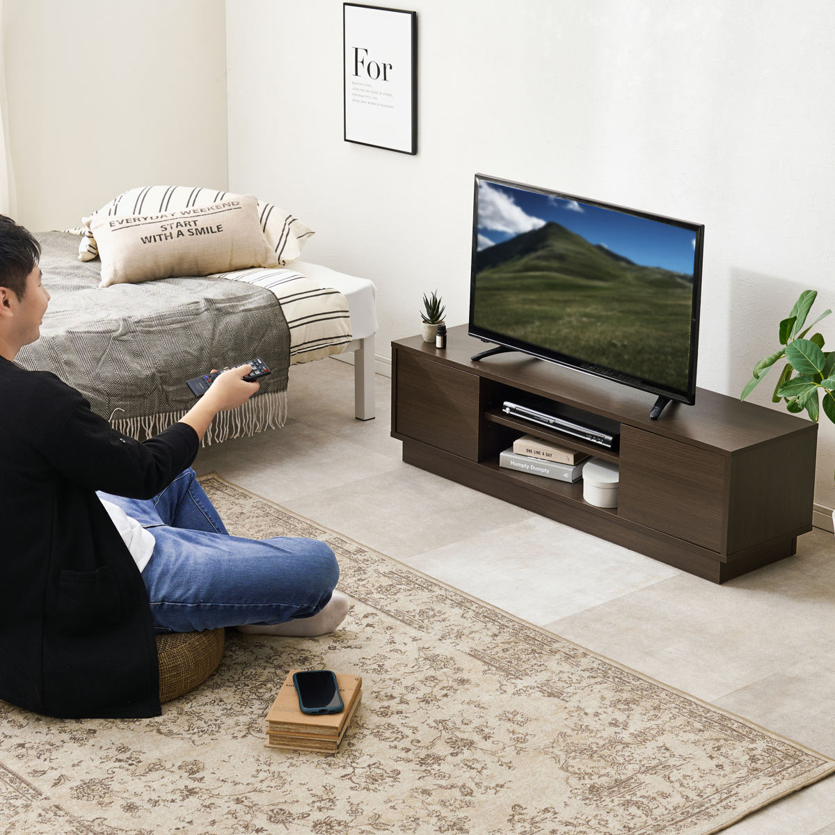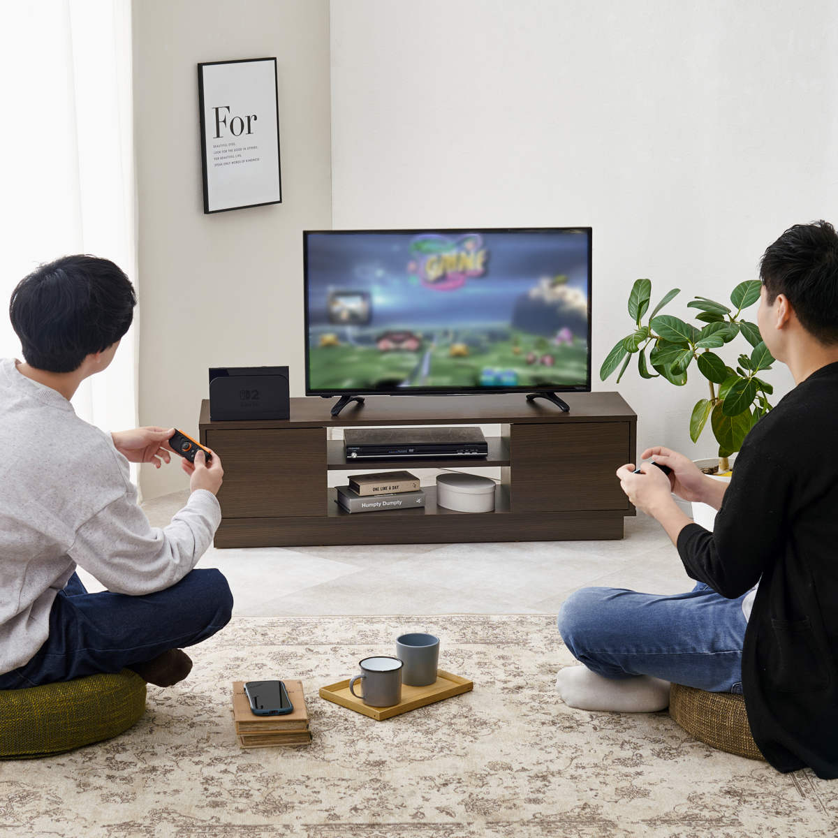 床に座ってリラックスする時間も、無理のない目線でテレビを楽しめます。
