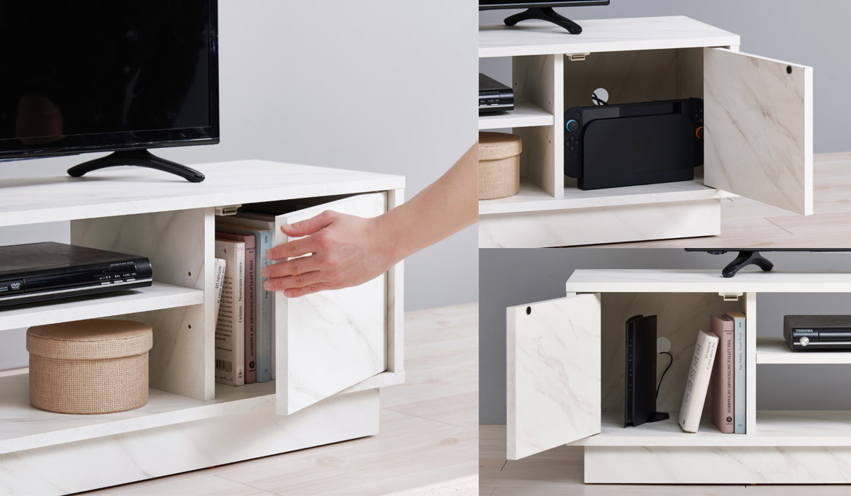 扉付き収納はゲーム機や本、ルーターなどをすっきり収納できます。扉は軽くて開けやすく、日常使いも快適です。