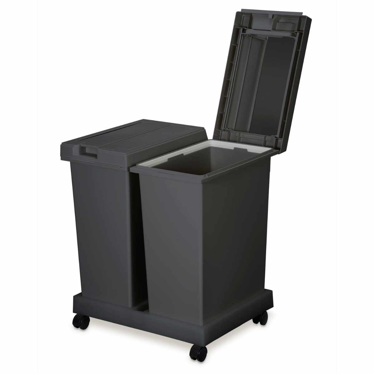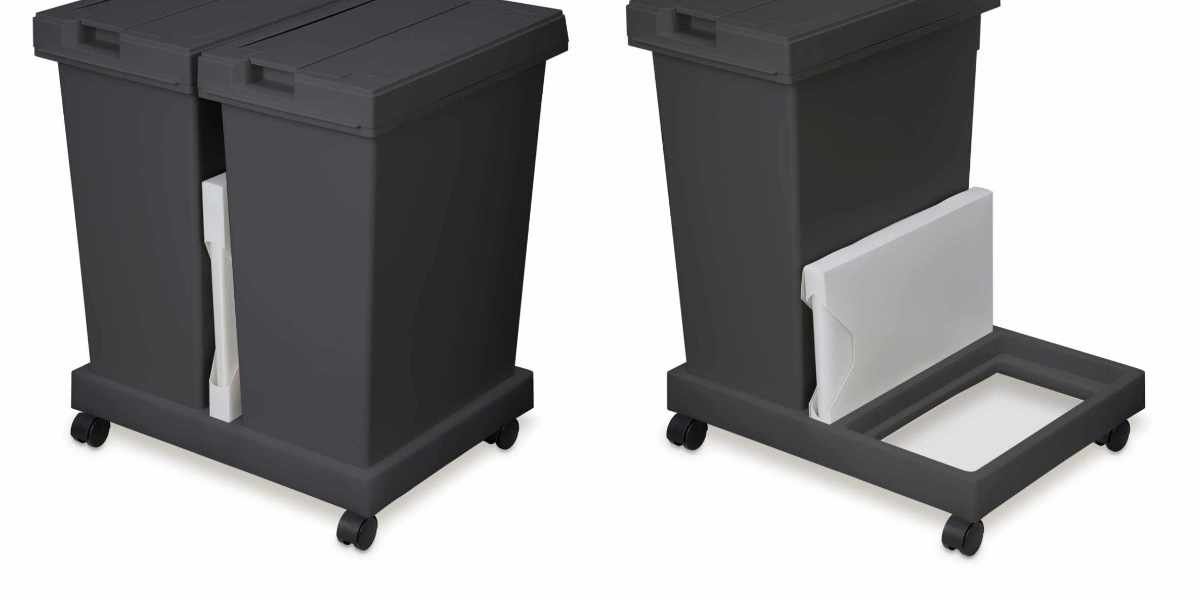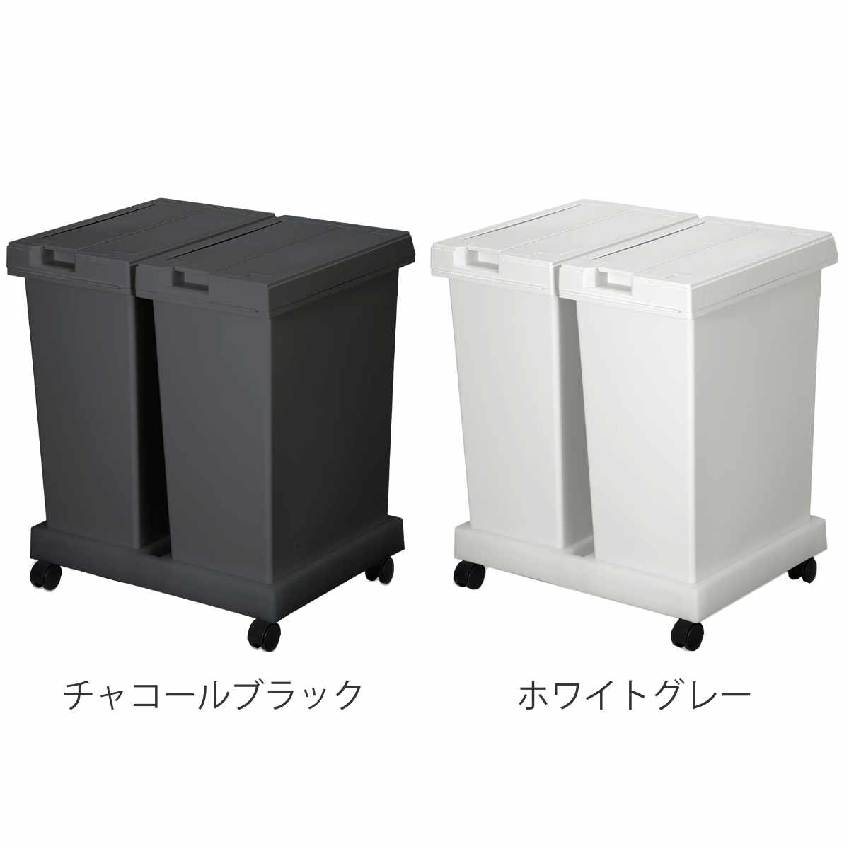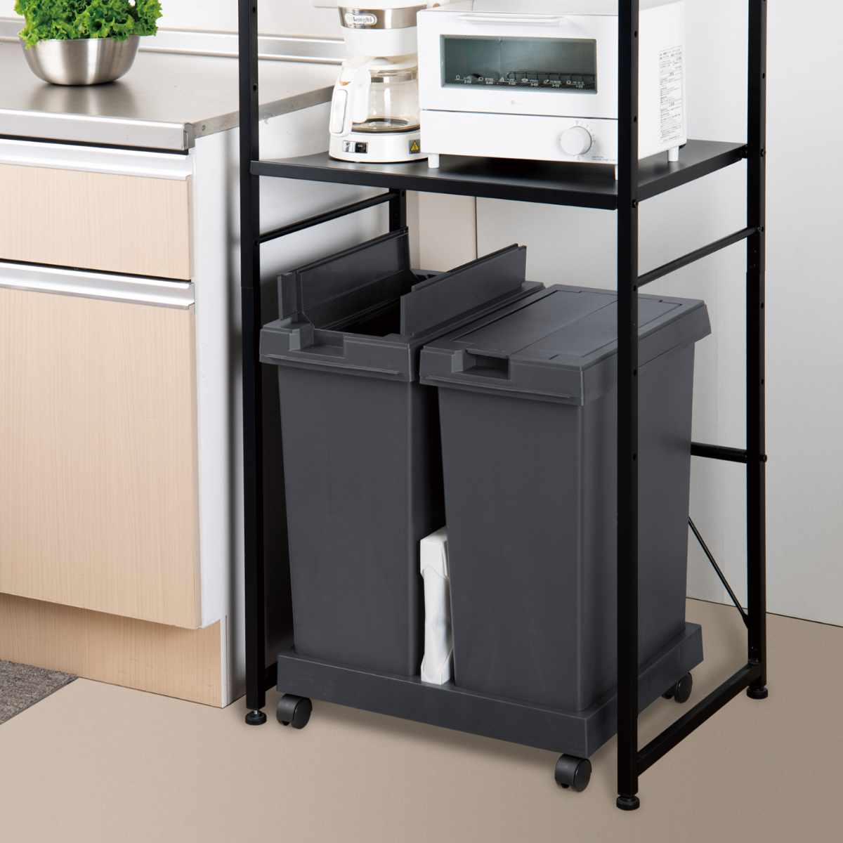 ペットボトルや缶などを分別して捨てることができるゴミ箱です。両開きなので開けたときのふたの高さがおさえられ、棚下やカウンター下などでも活躍します。