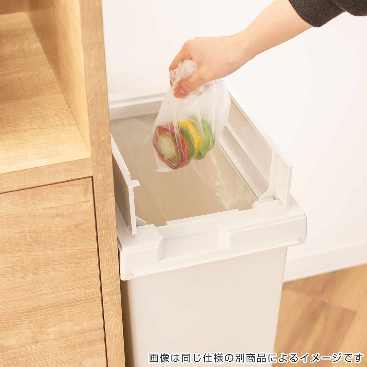ふたが大きく開くので、ゴミの取り出しが簡単です。枠には袋を留めるストッパーが付いており、ゴミ袋がズリ落ちにくい設計です。