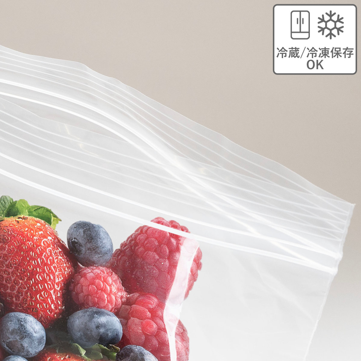 Wジッパー仕様で液もれしにくく、冷蔵・冷凍に対応しています。食材や料理の小分け保存に便利です。
