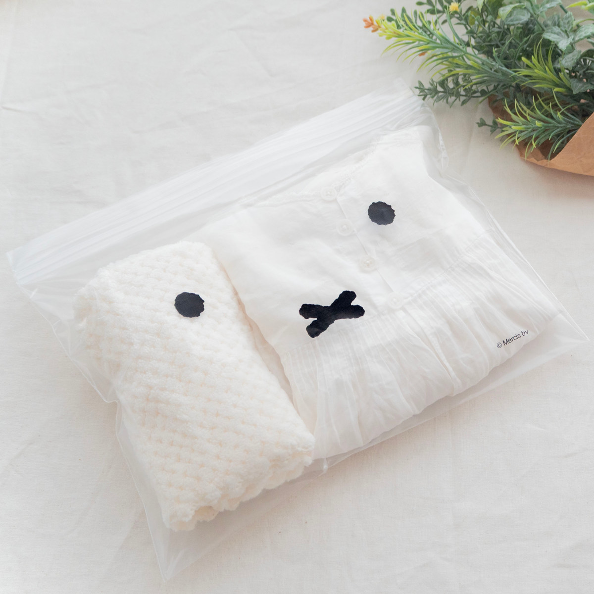 ミッフィーのお顔がプリントされた、シンプルで使いやすい保存袋です。透明なので中身がひと目でわかり、すっきり整理できます。