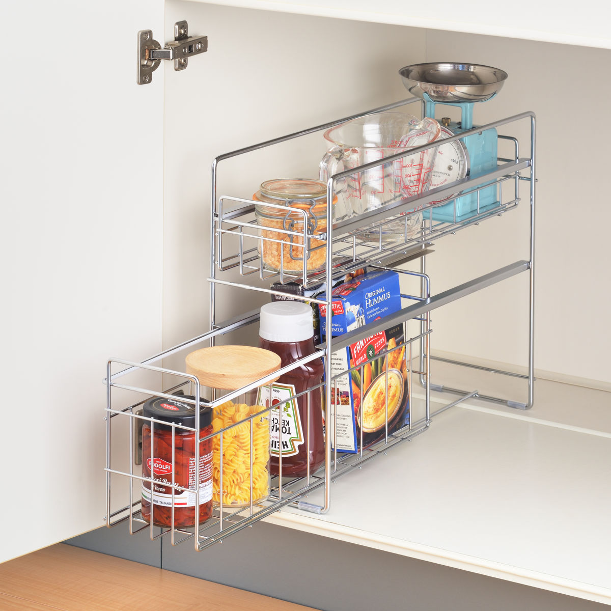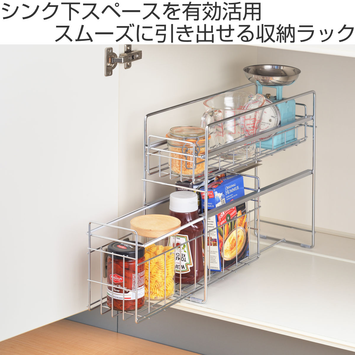 シンク下のスペースを有効活用できる収納ラックです。引き出しタイプなので奥の物も取り出しやすく、調理器具やストック品などをすっきり整理できます。